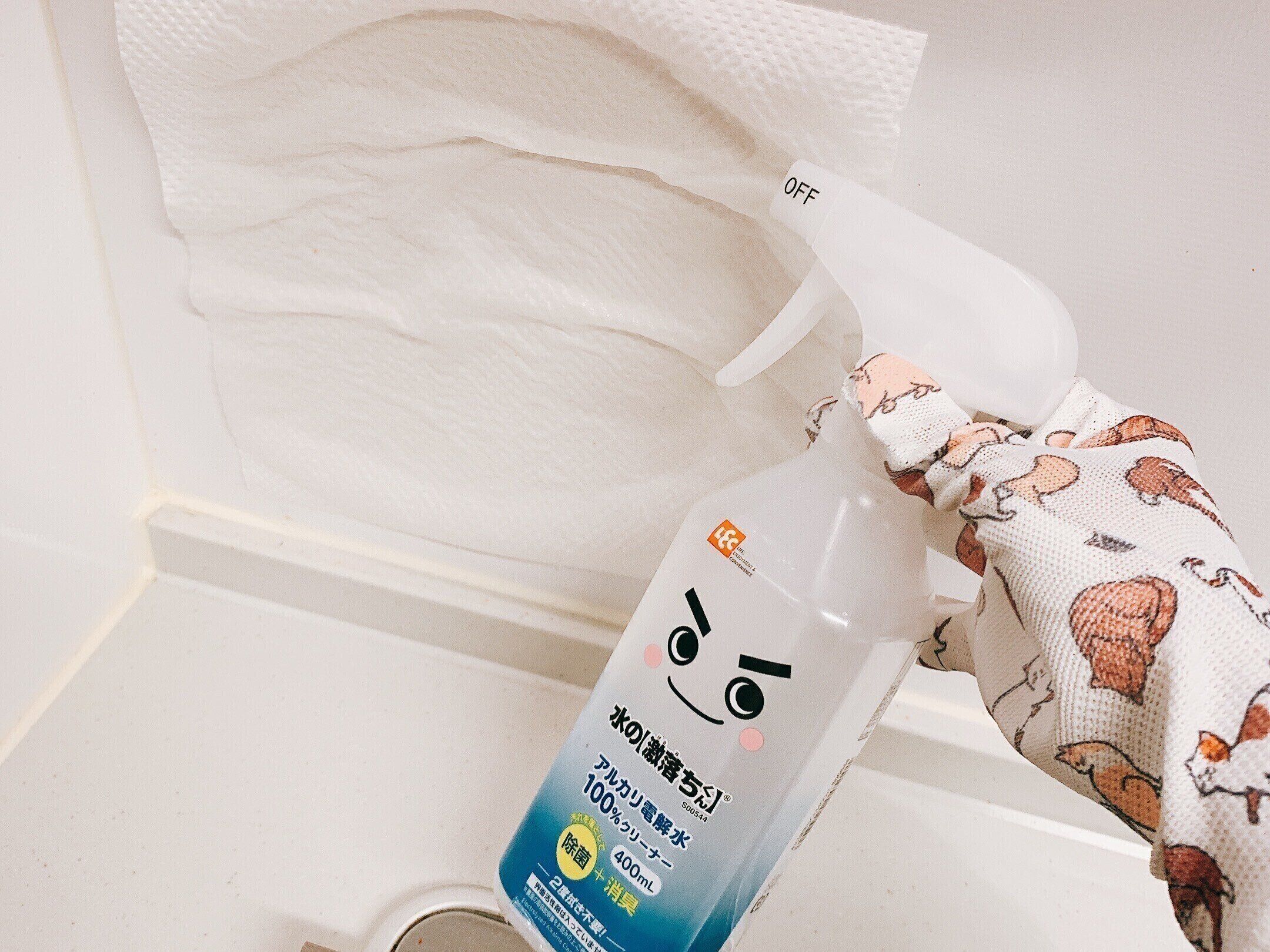 アルカリ電解水を吹きかけることで、キッチンペーパーが壁に張り付きます。しっかりとキッチンペーパーを湿らせてください。