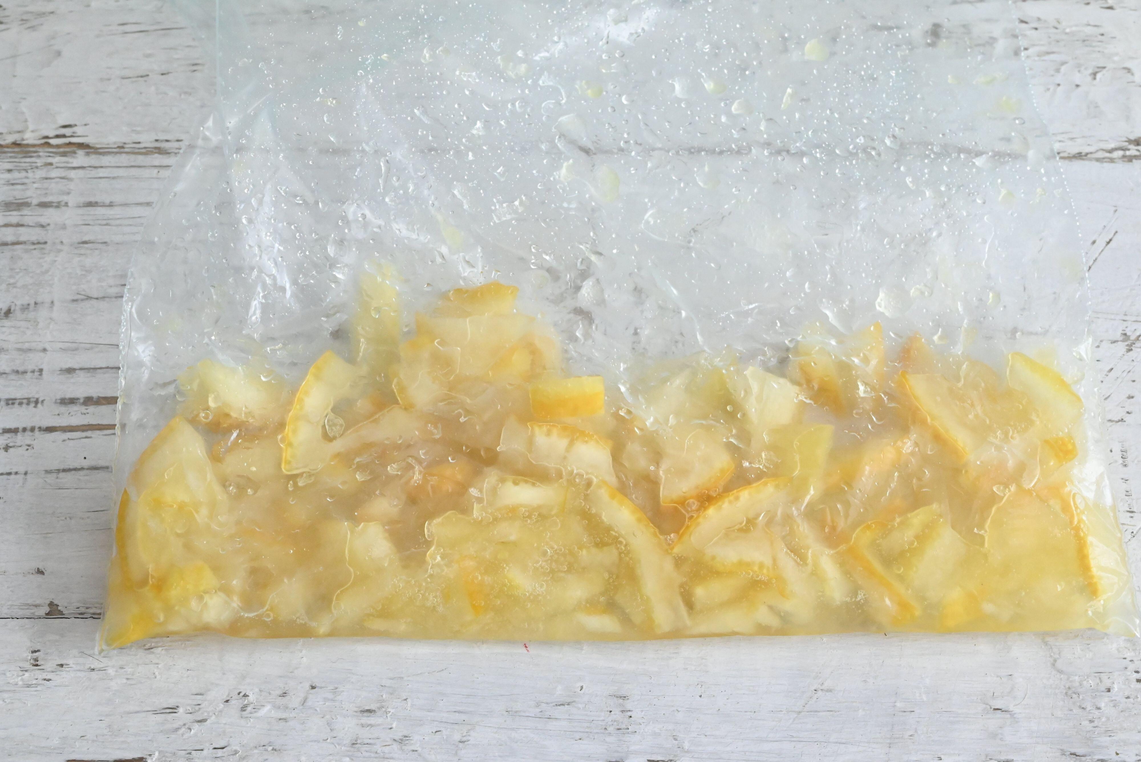 (2)食品用ポリ袋にレモンとグラニュー糖を入れてよくもみ、冷蔵庫に一晩置いて完成。