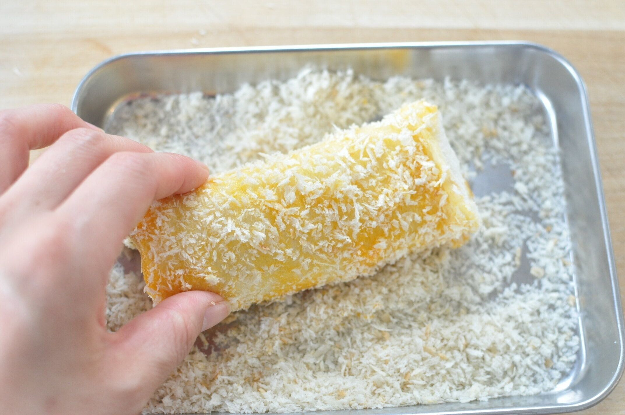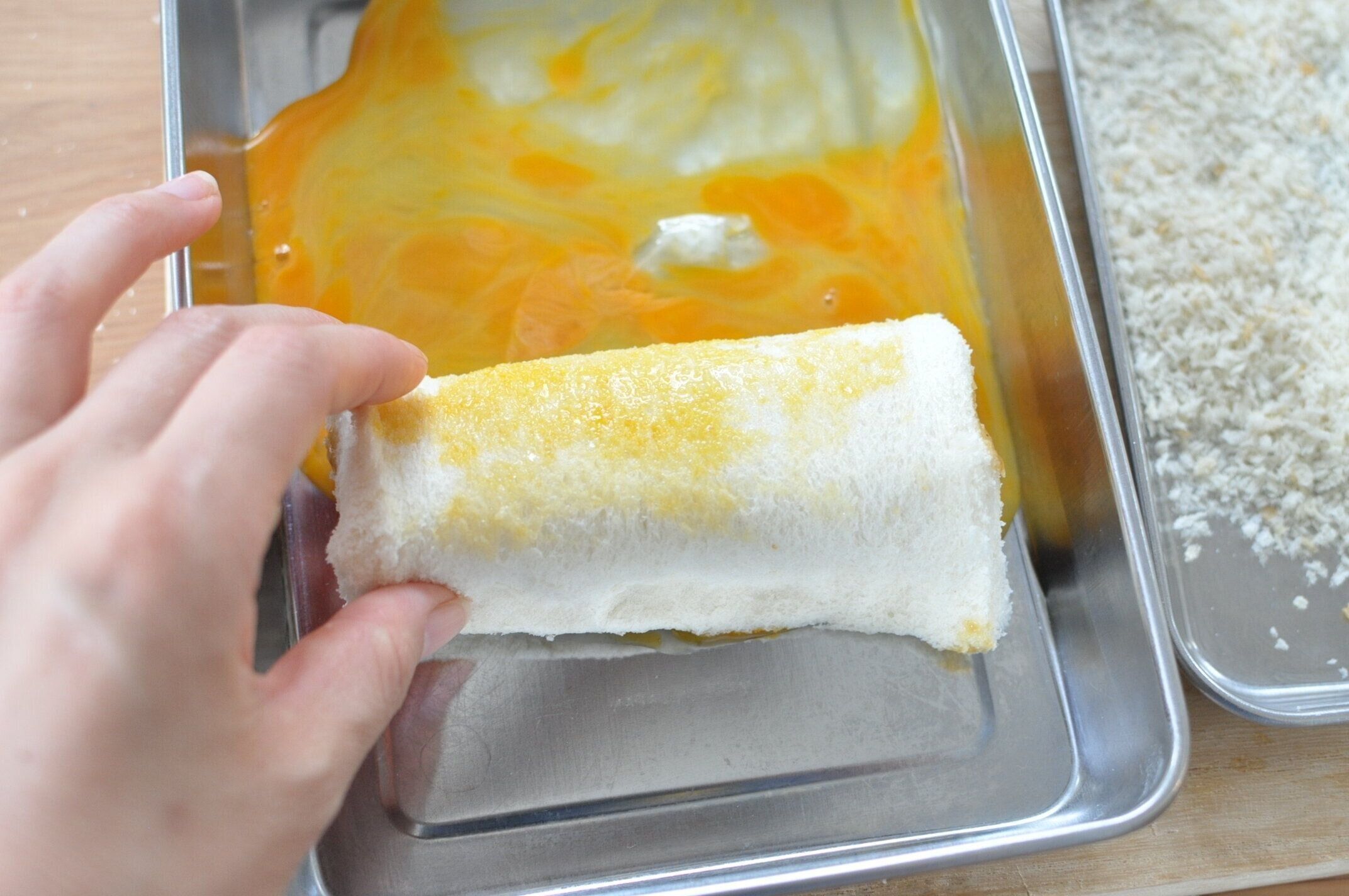 卵をつけたら、すぐにパン粉をつけます。一時的に置くときは、巻き終わりを下にして置きます。