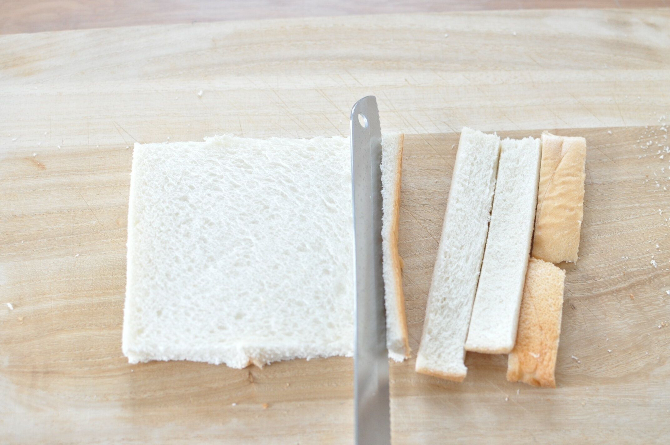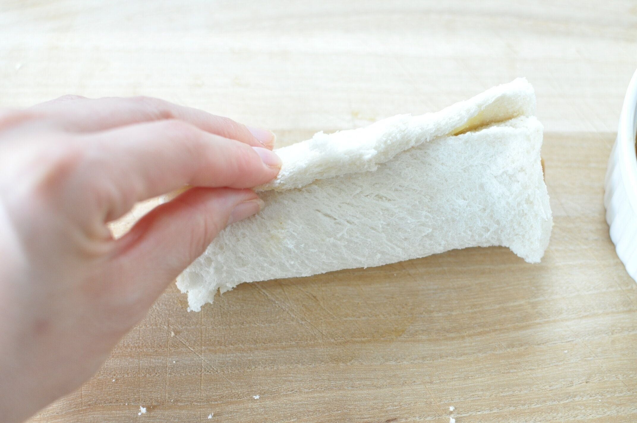 パンに手をのせて、グイグイ押してつぶします。フワフワの状態だと巻きこみにくいので、思い切って押してください!