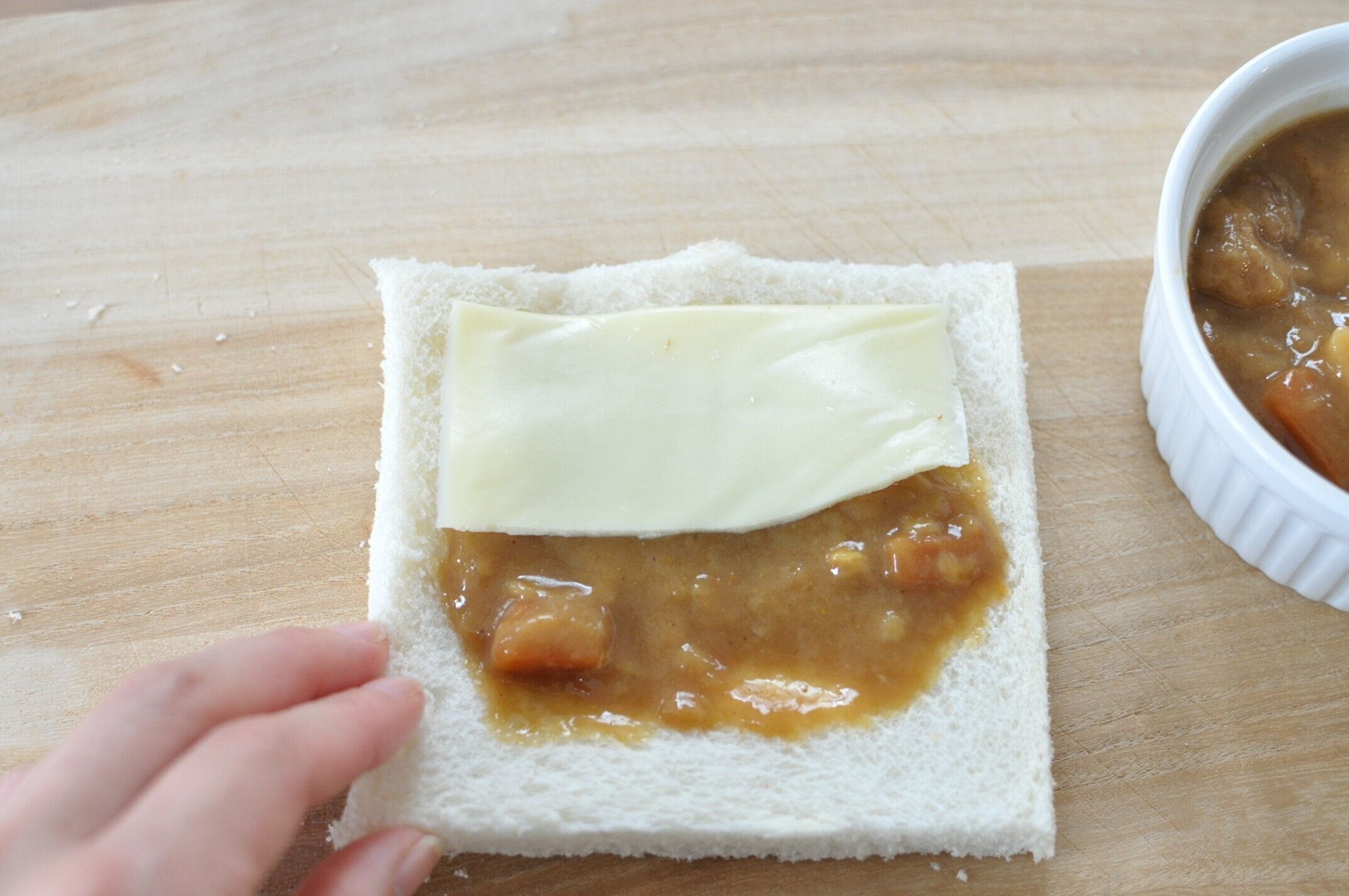 パンの真ん中にだけカレーをのせます。巻き始め、巻き終わりと両サイドにはカレーをのせません。
