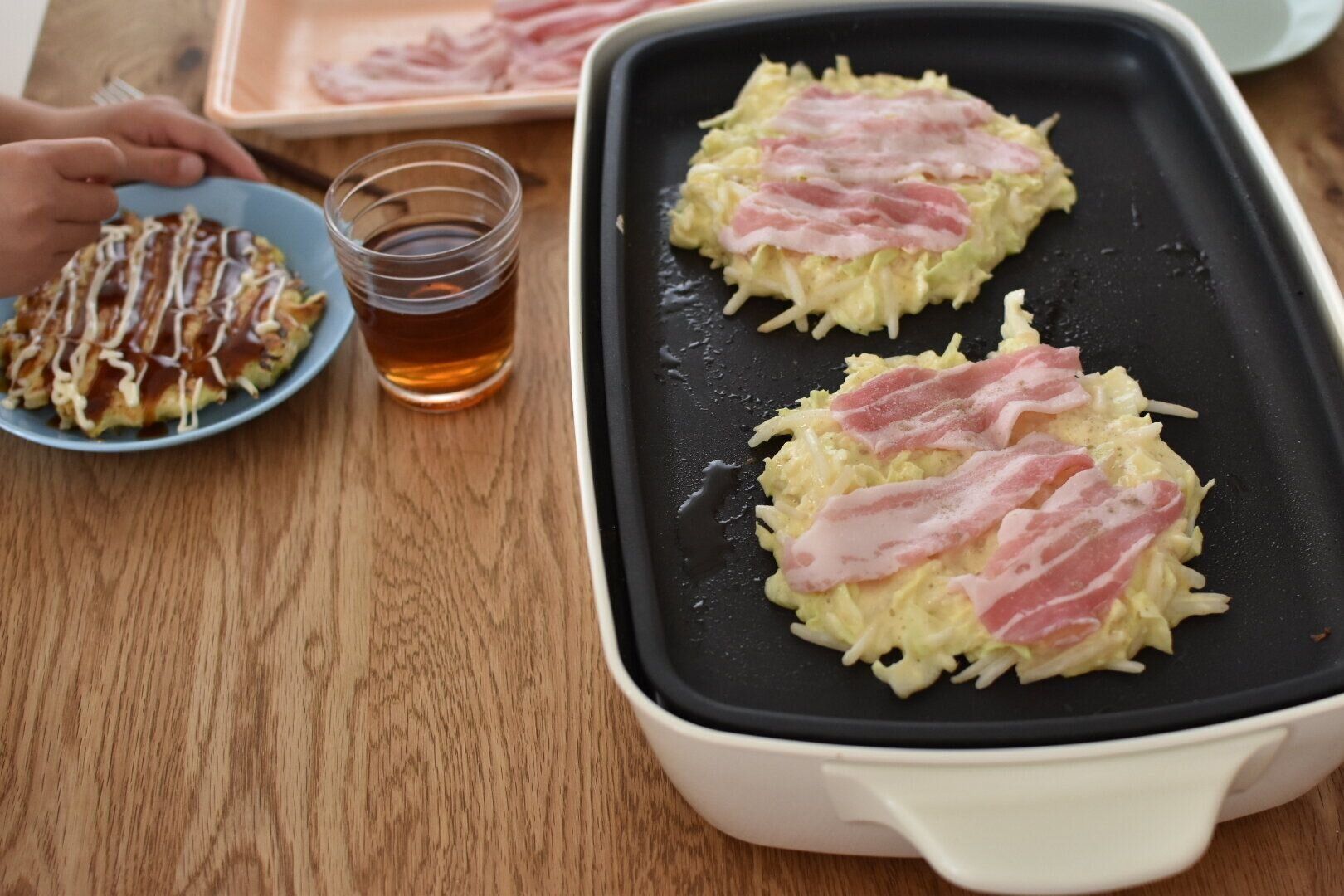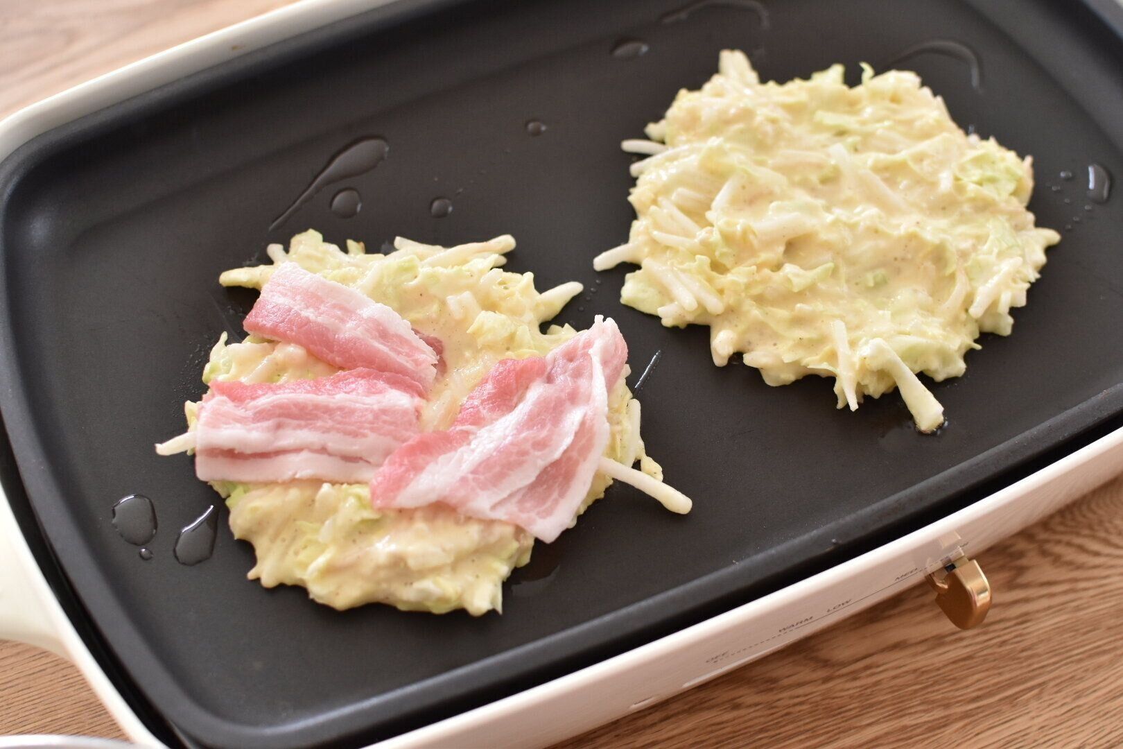 2.ホットプレートを加熱し、生地を丸く形を整えたら豚バラ肉を並べる。