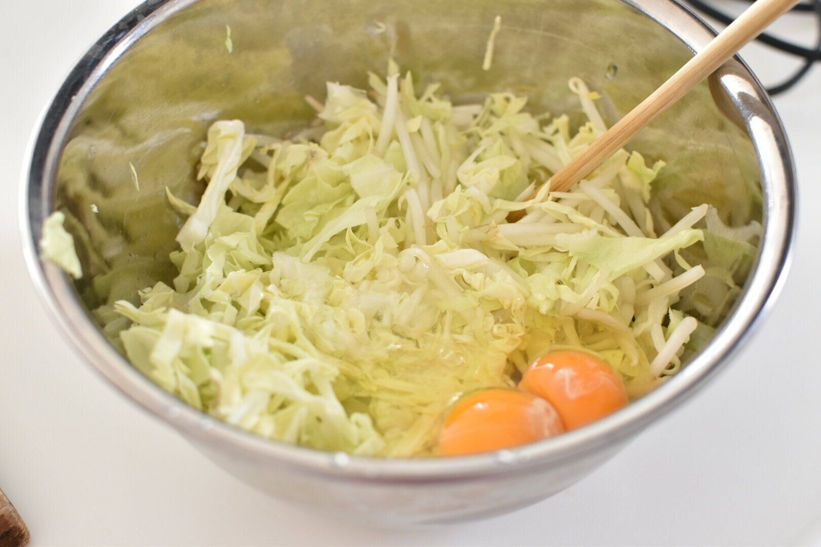 1.キャベツは薄切りにし、もやしと合わせてボウルに入れる。