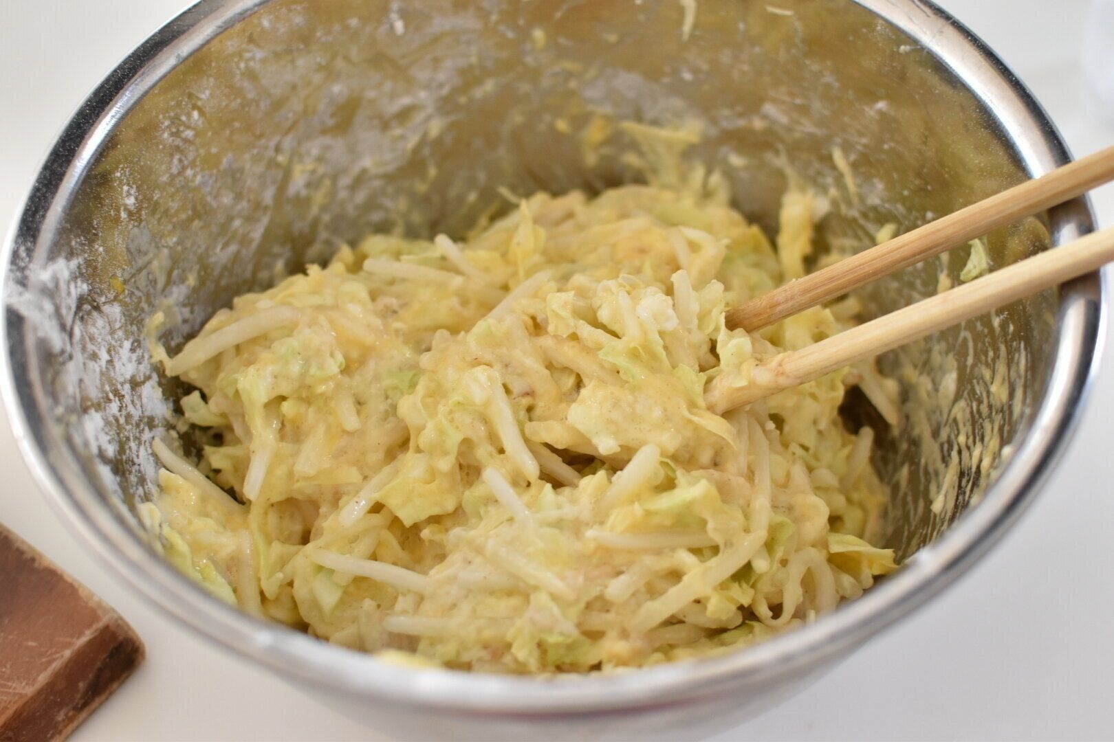 もやしのシャキシャキ食感と長芋入りのふわっとした生地が特徴です。