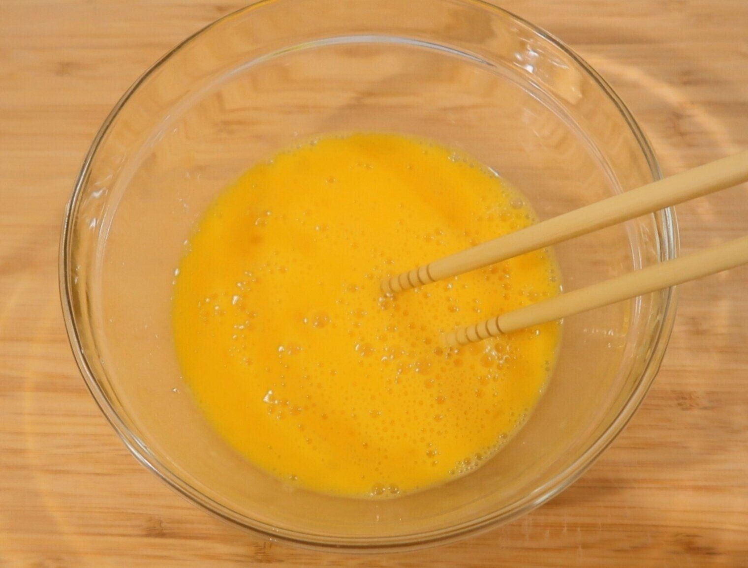ボウルに卵を割り、しっかり溶きほぐします。箸で白身をつまむようにすると均一に混ざりやすくなります!