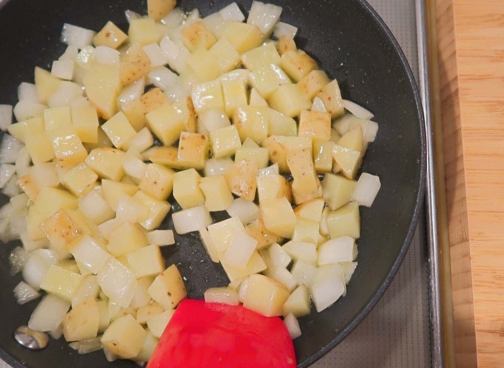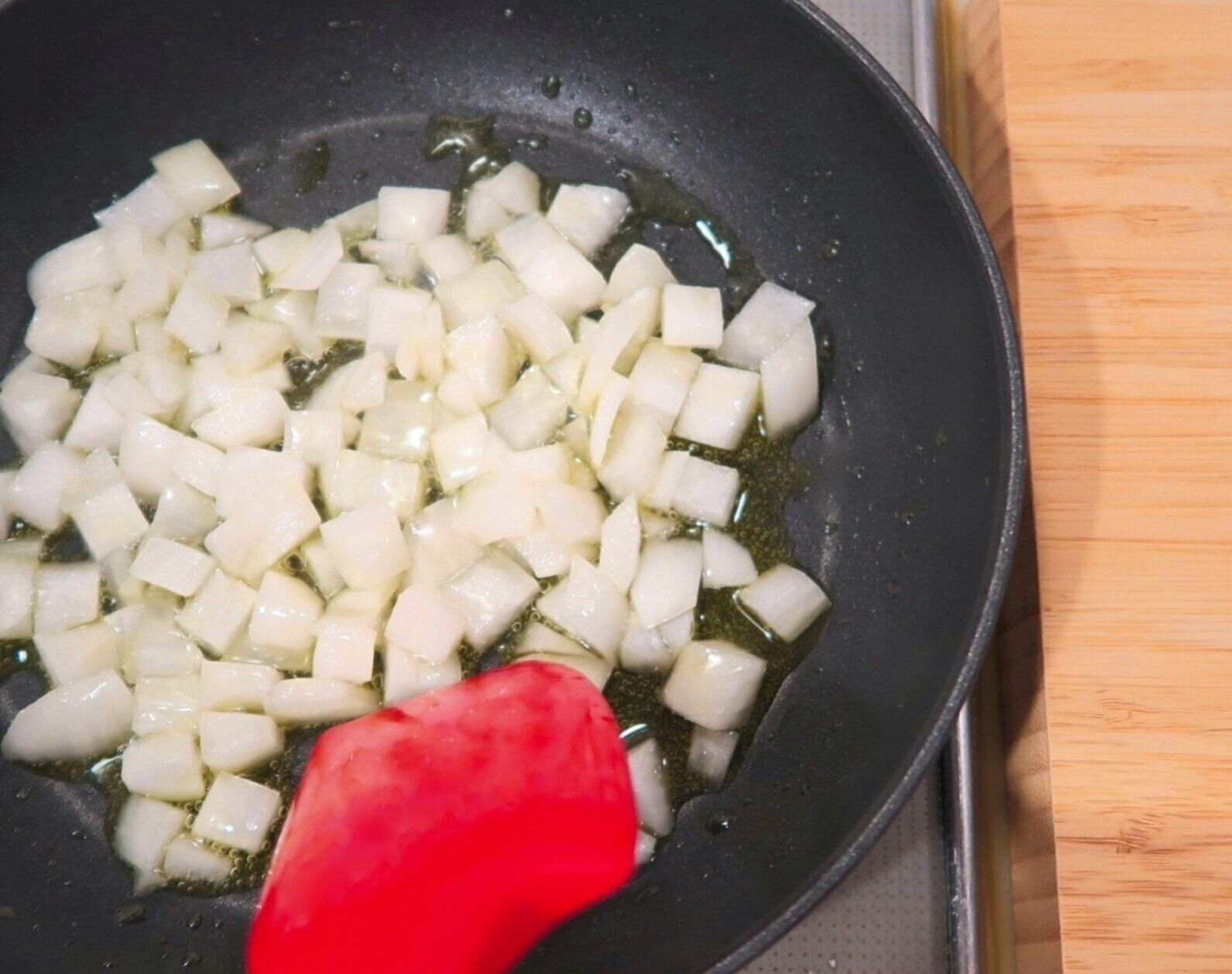 小さめのフライパンにオリーブオイルを中火で熱し、新玉ねぎを約2分炒めます。