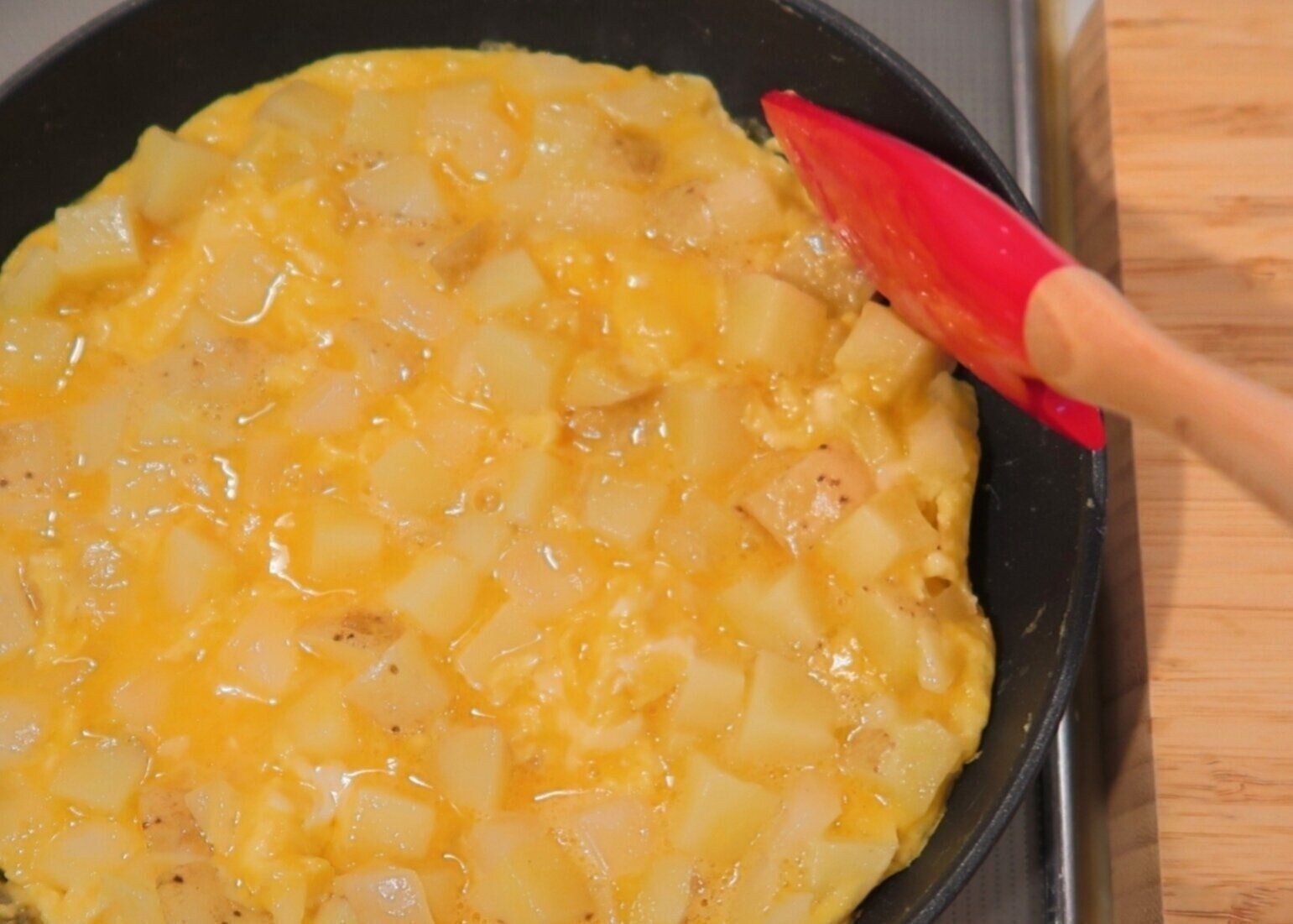 フライパンを傾けるとゆっくり流れる程度の半熟状になったら、ふたをして弱火で約3分焼きます。