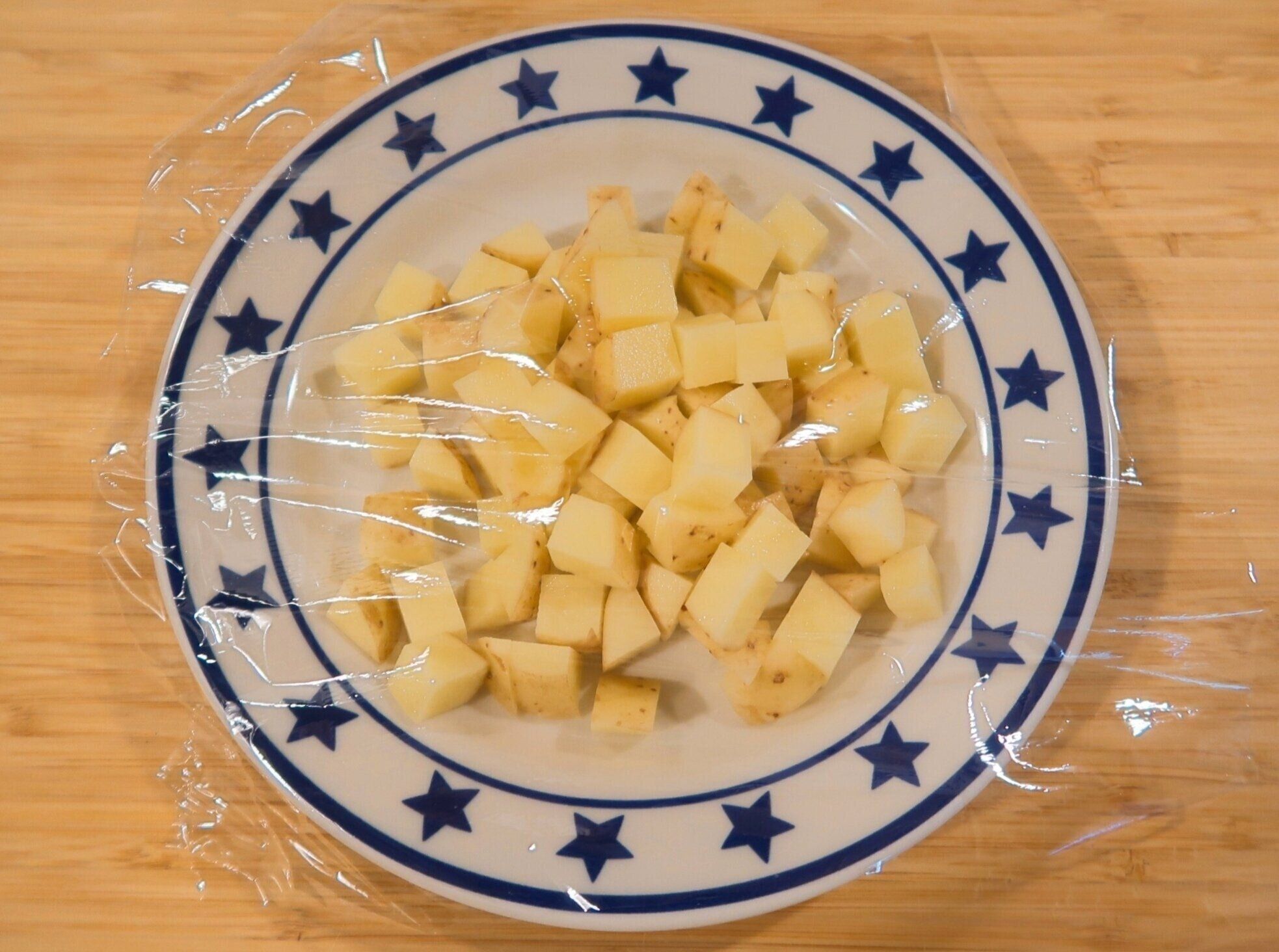 新じゃがはよく洗い、芽を取り除きます。つづいて皮ごと約1cm角にカットします。