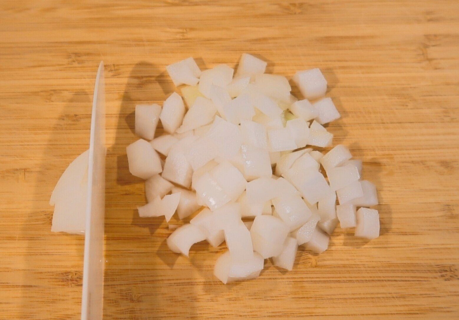 新玉ねぎは皮をむき、約1cm角にカットします。