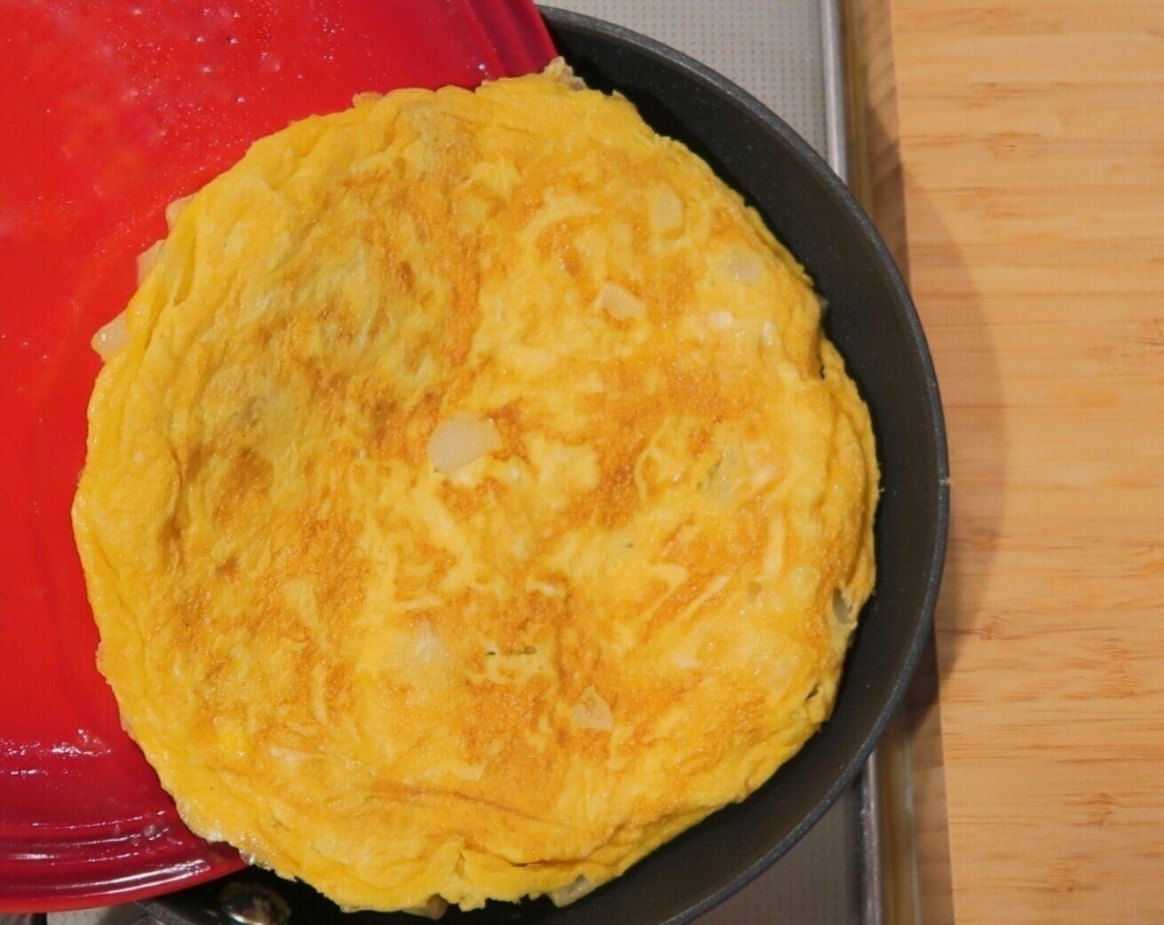 ふたを外し、ヘラでオムレツのふちを一周はがします。