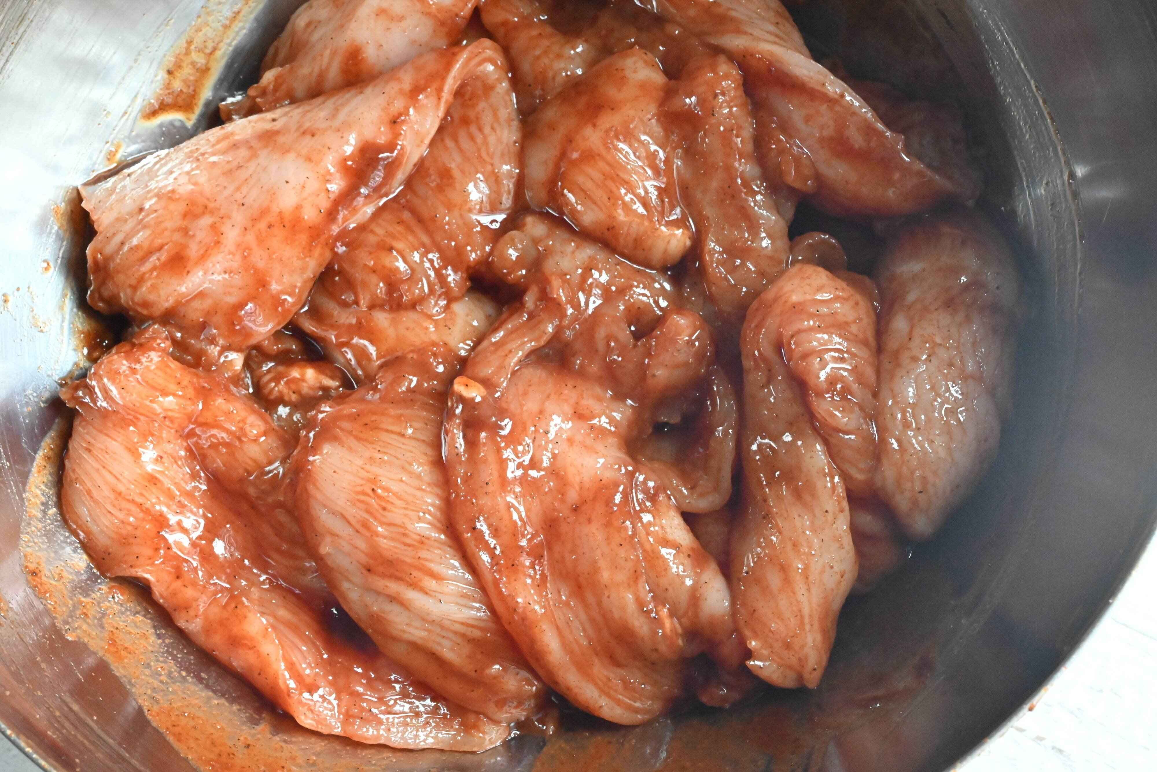 1)むね肉の皮と余分な脂を取り除き、厚さ1cmのそぎ切りにして「台湾フライドチキンの素」に30分漬ける。