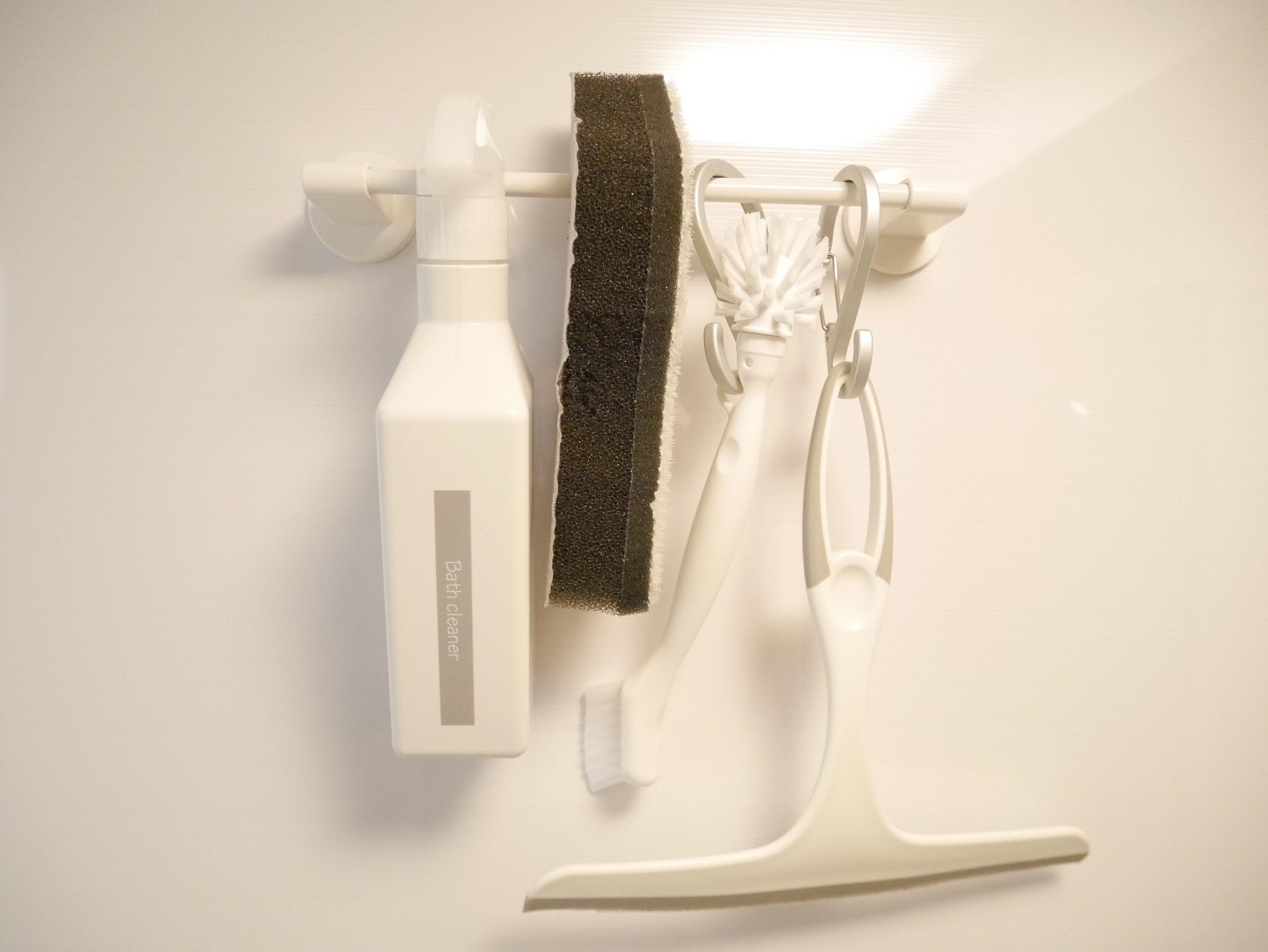 お風呂の壁にマグネットで取り付けられるタオルバーを取り付け、引っ掛けられる形状の掃除用品は、直接引っ掛けて浮かせています。