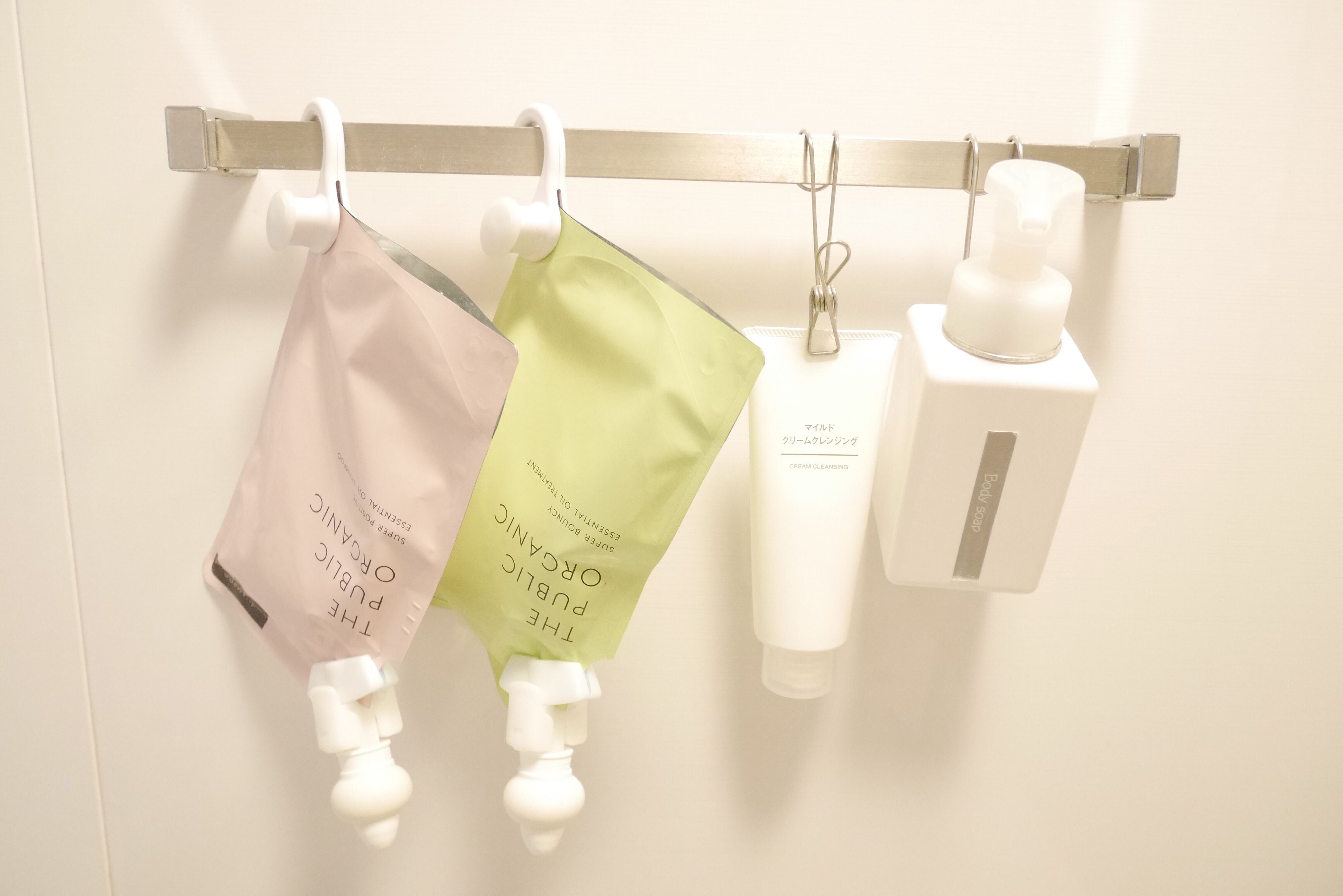 左から、シャンプー・トリートメント・クレンジング・ボディーソープです。重みがあるため、備え付けのタオルバーを使って吊るし、浮かせています。