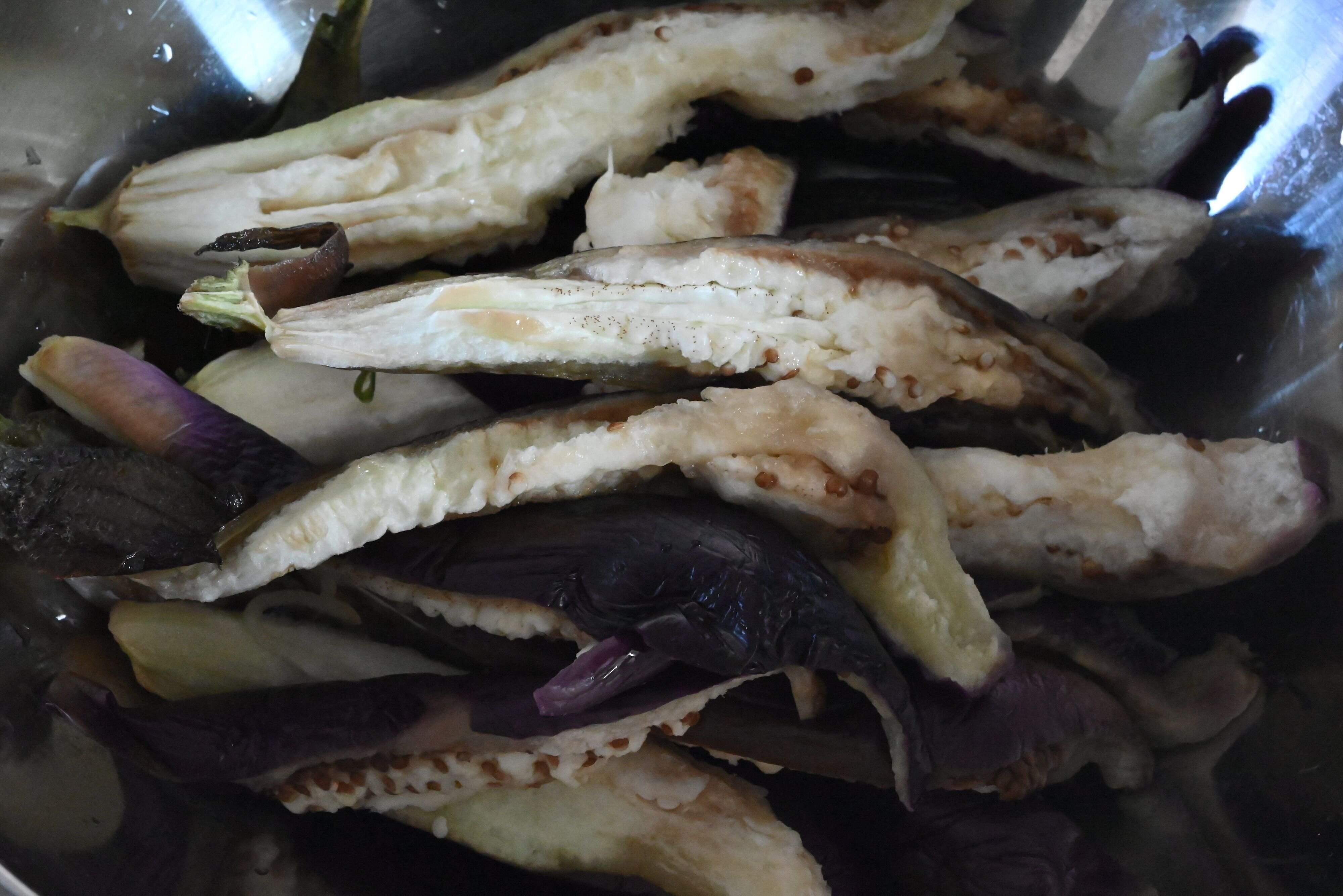 (2)なすを入れて4分茹でたら水気を切り、粗熱を取って6等分に手で割く。