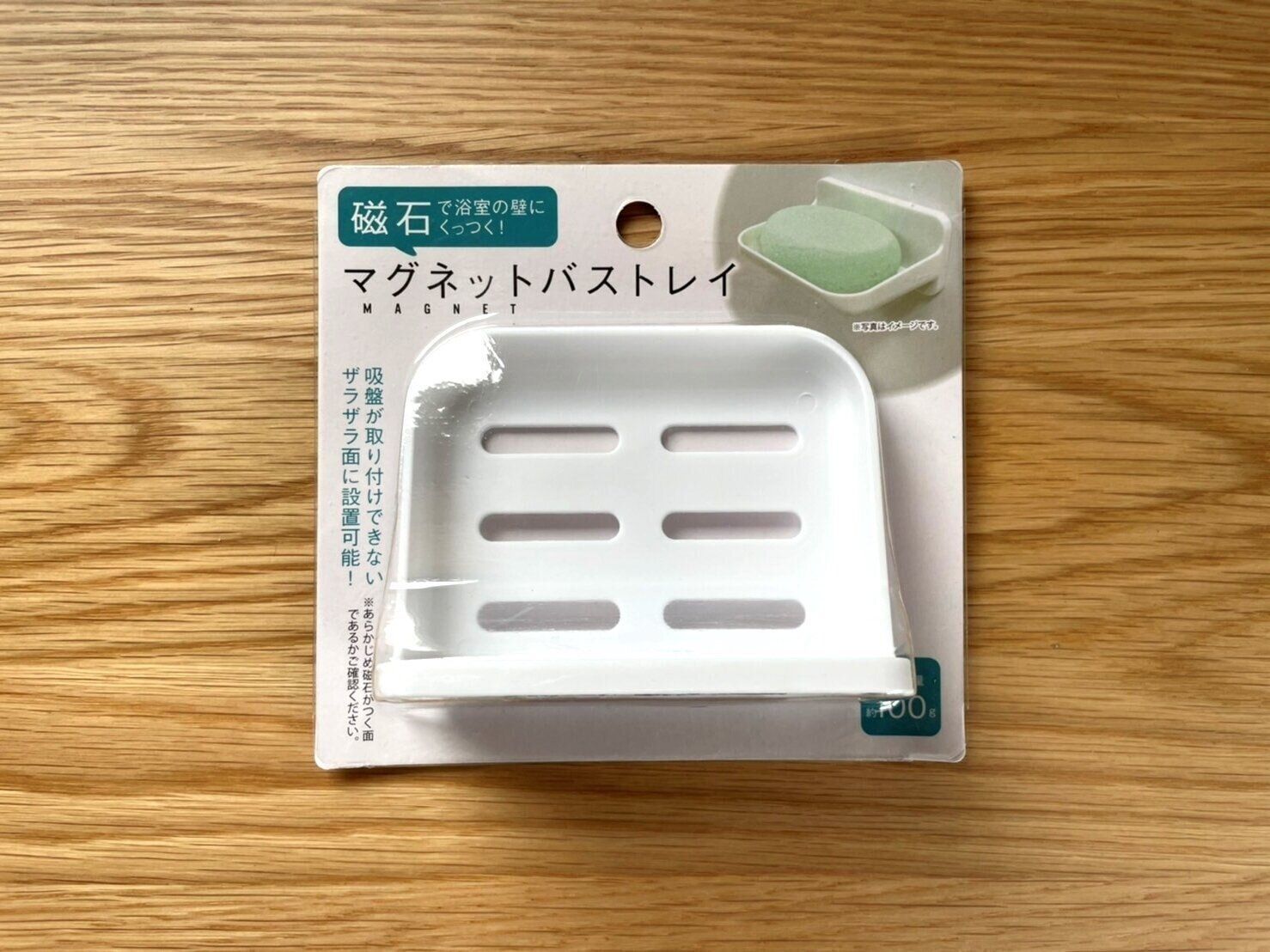 石鹸派の皆さんにおすすめの壁面収納が「マグネットバストレイ」(110円)です。耐荷重量は100g。吸盤タイプの石鹸収納もありますが、壁にしっかりくっつかずに落ちてくることもあるので、磁石の壁面収納はとても便利です。