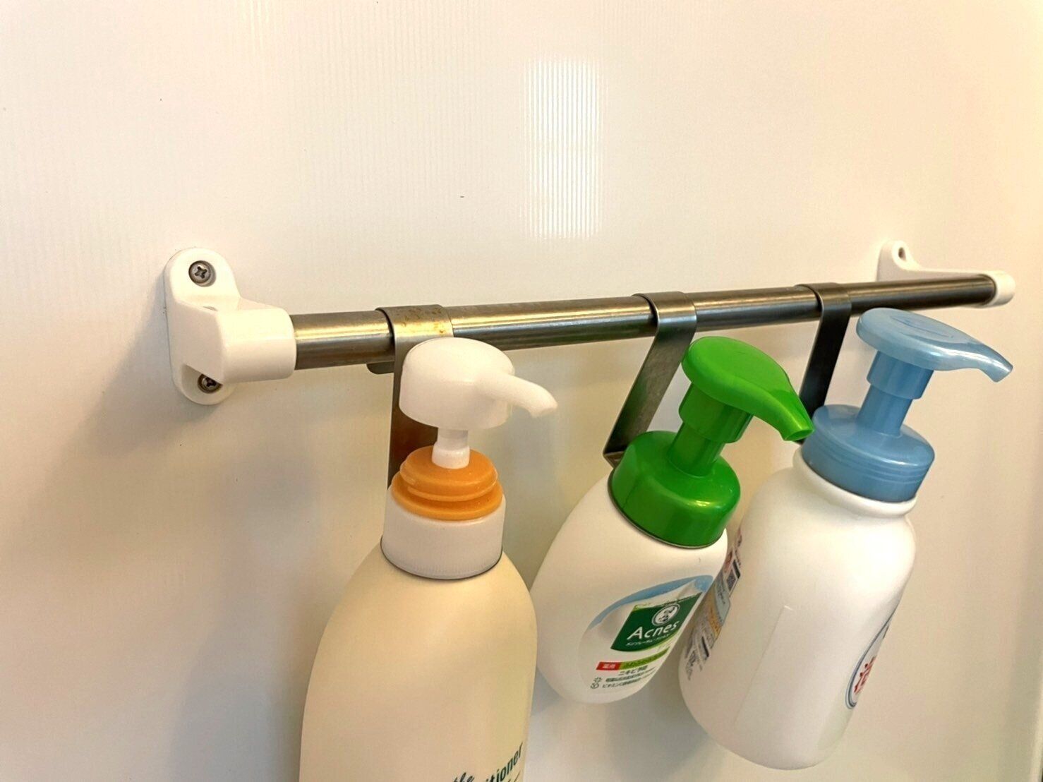 吊り下げたままポンプのプッシュをすると荷重が許容を超えてしまう可能性が高いので要注意ですが、空中に浮かせられるので、風呂掃除がとてもラクになりますよ。