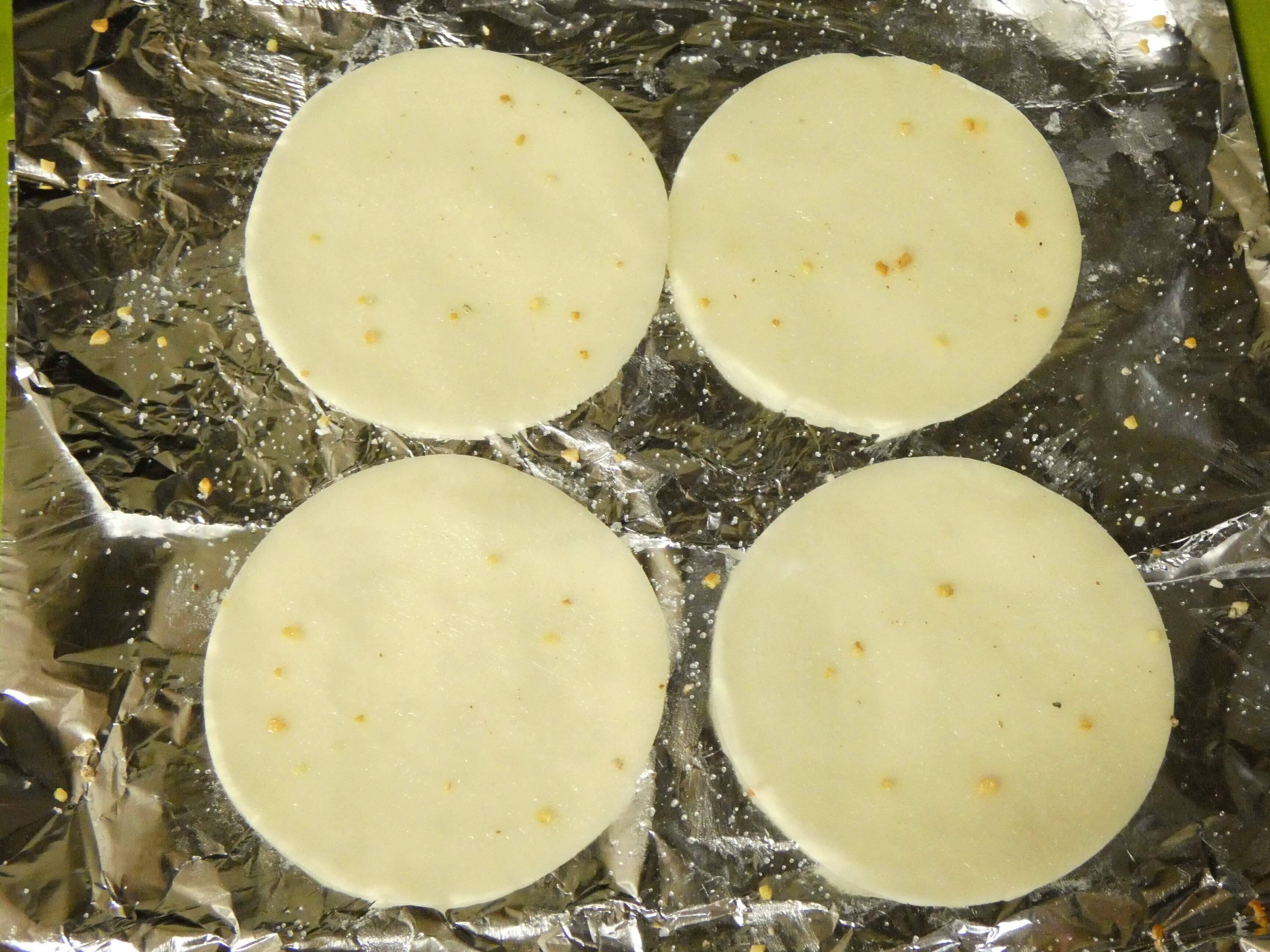 【2】塩とガーリックパウダーを混ぜ合わせ、餃子の皮に振りかけます。トースターで焼き、きつね色に焼き色がついたら完成。