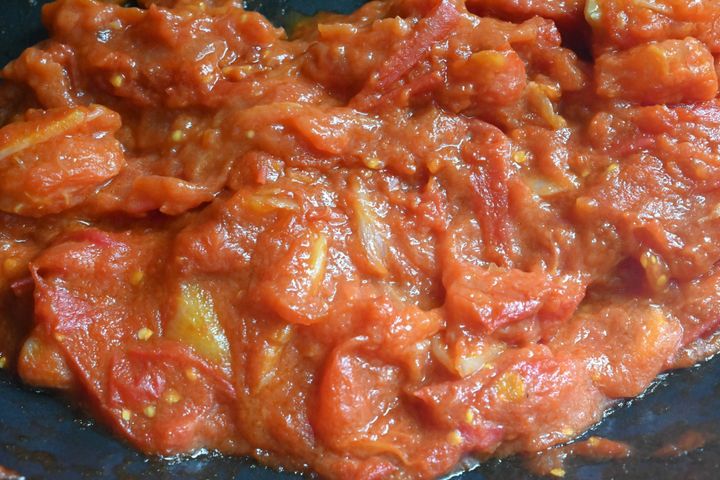 (2)香りがでてきたら中火にし、ざく切りにしたトマトと塩を入れ、水分がなくなるまで加熱する。