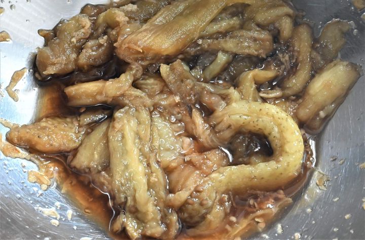 (2)なすがやわらかくなったら皮を剥いて食べやすい大きさに割いてボウルに入れる。