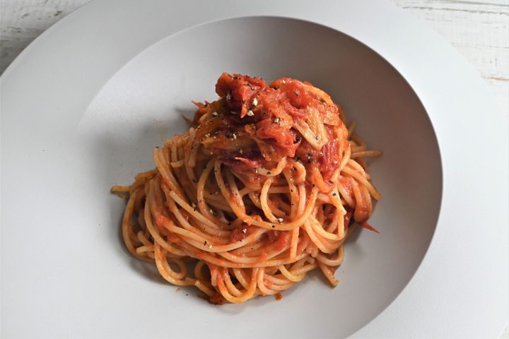 トマトを水気がなくなるまで煮詰め、パスタと合わせるひと品です。