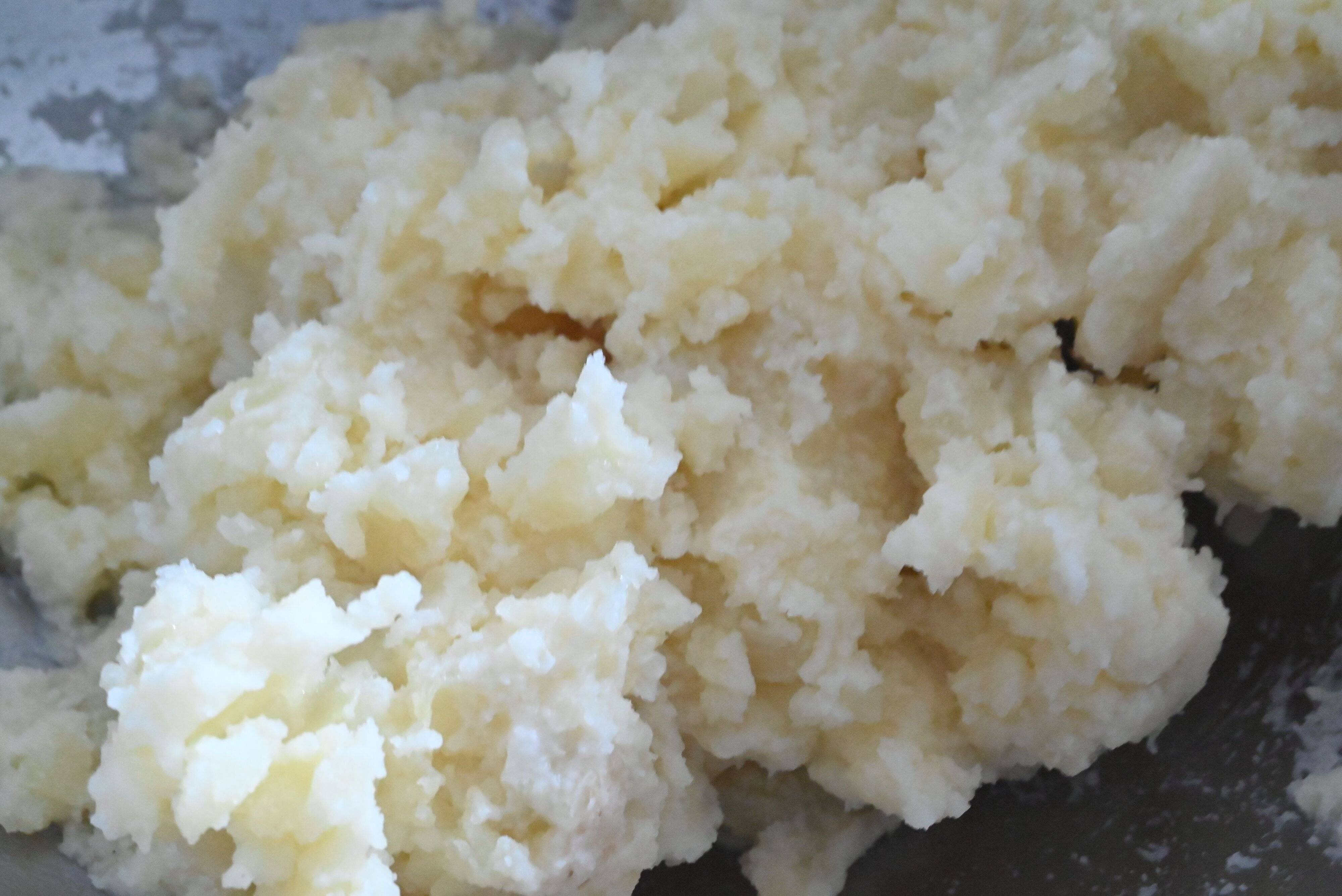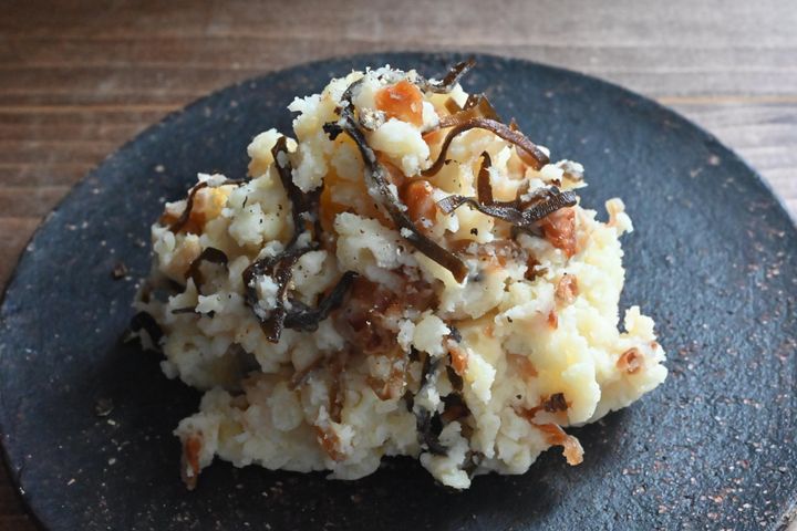 (2)クリームチーズ、フライドオニオン、塩昆布、ガーリックパウダーを加えてよく混ぜる。塩、ブラックペッパーで調味して完成。