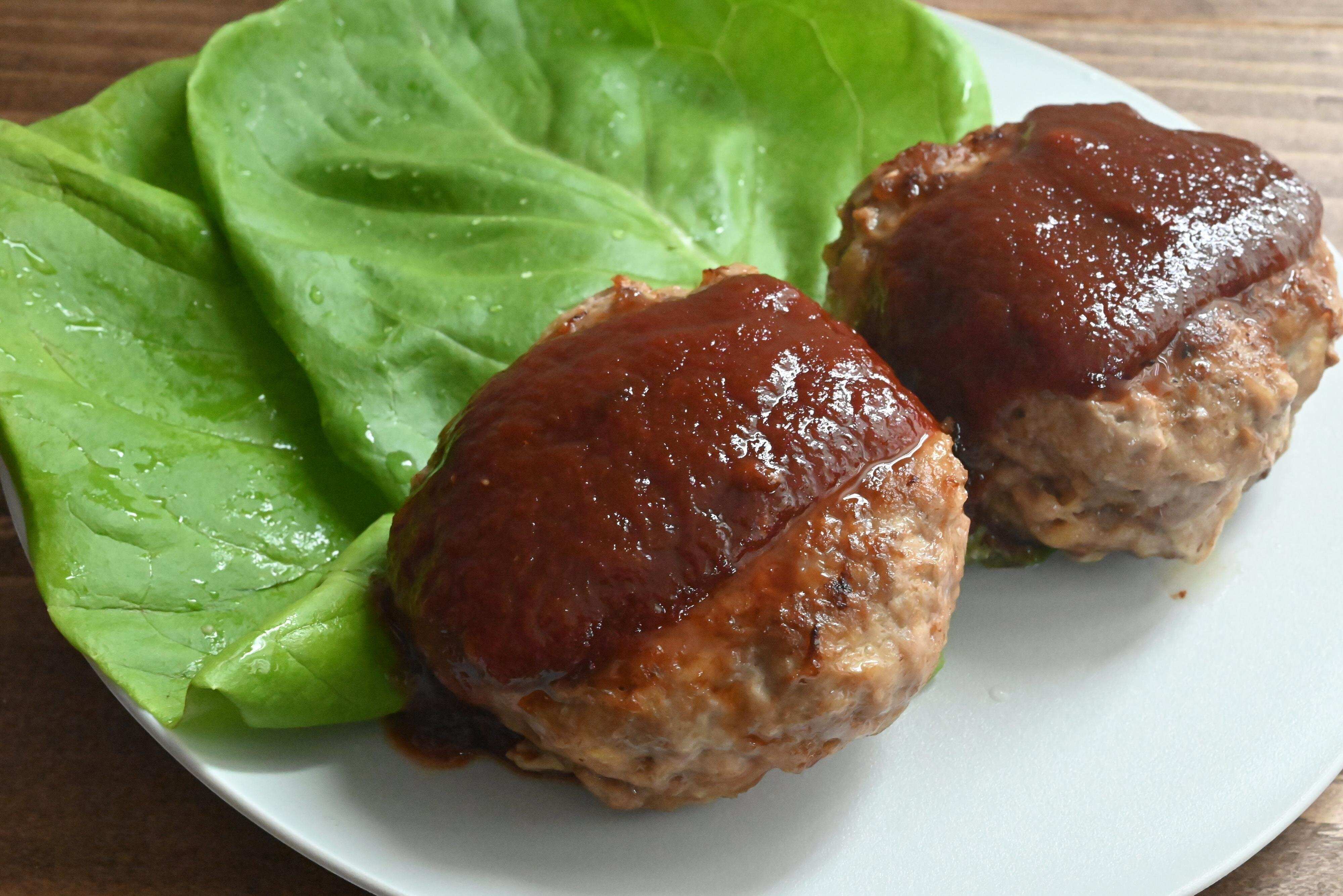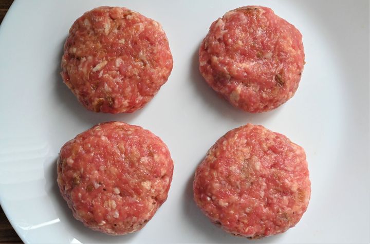(1)合いびき肉、フライドオニオン、パン粉、卵、塩、ブラックペッパーを加えて混ぜ、4等分にしてハンバーグの形に成型する。