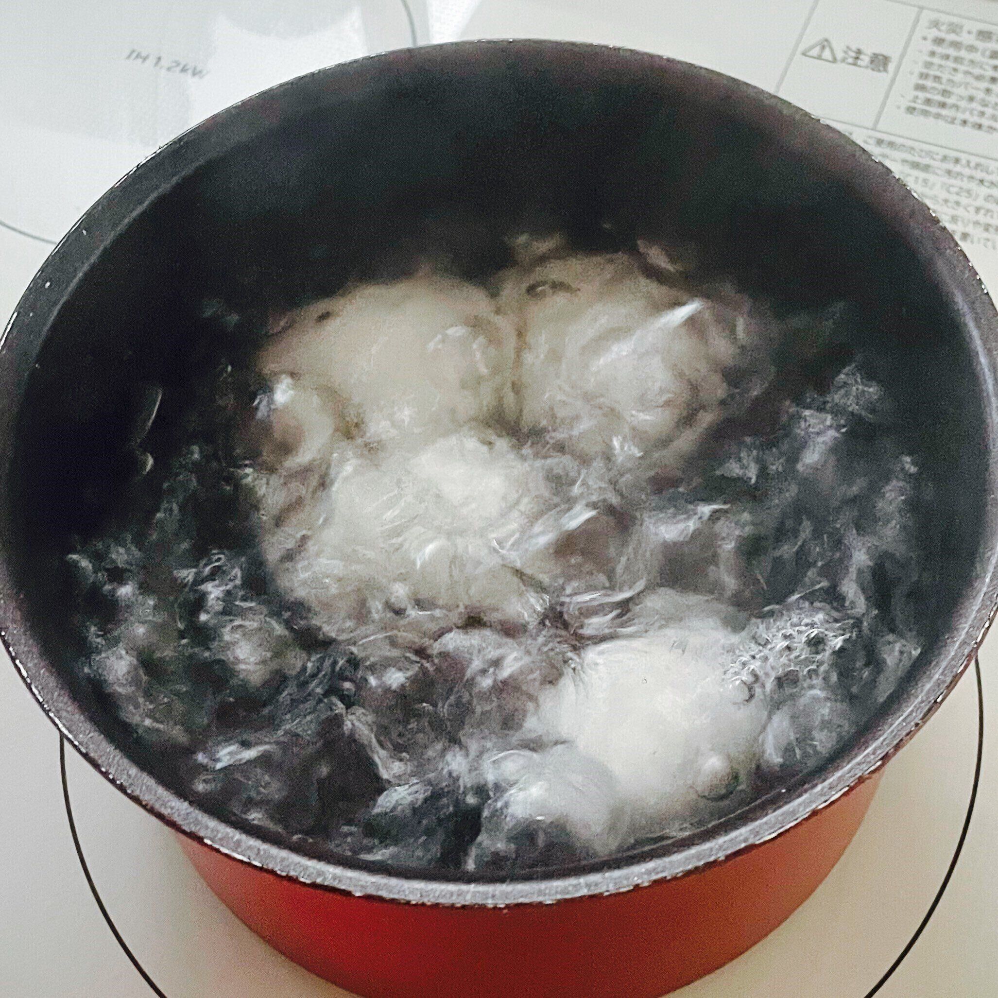 各ご家庭でゆで卵の作り方があると思いますが、我が家は中がトロトロの半熟味たまが好みなので、沸騰したお湯に冷蔵庫から出したての玉子をお玉などを使いそっと入れてそのまま7分ゆでます。