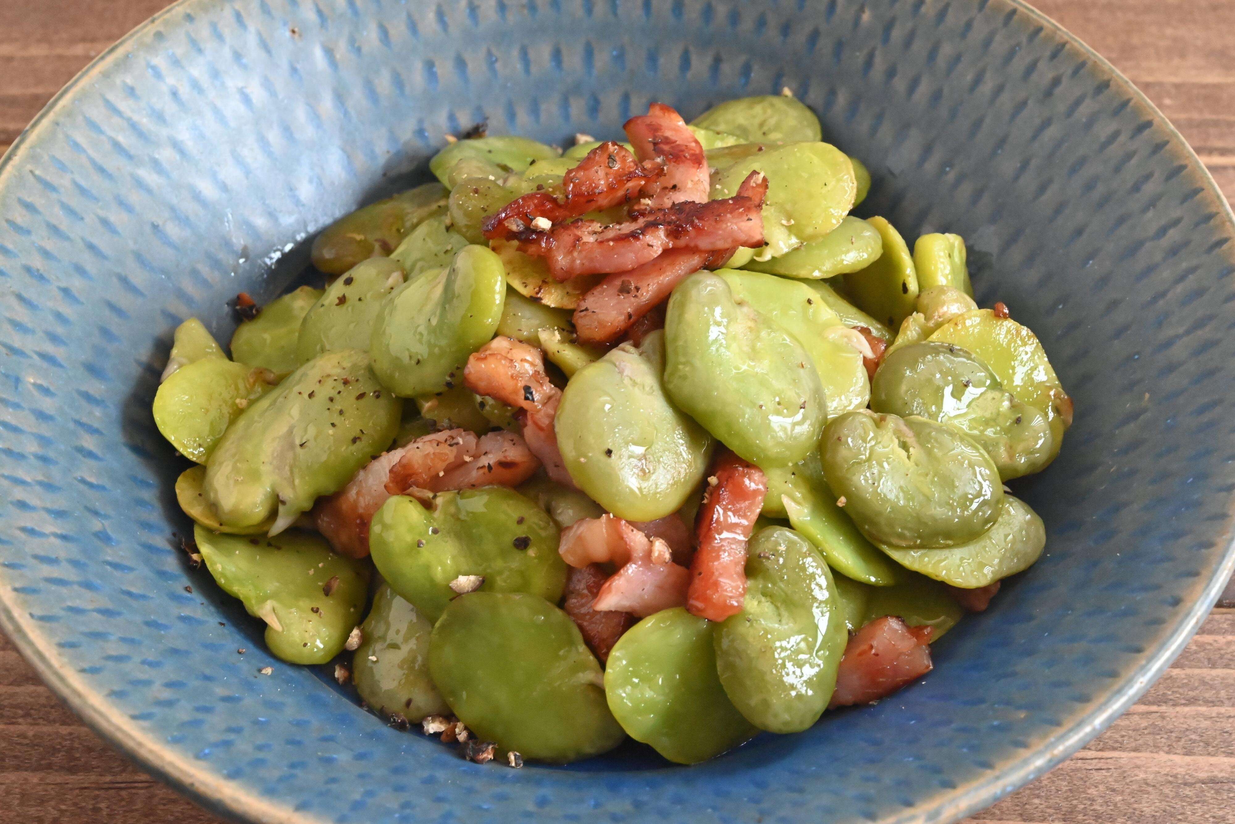 カリカリのベーコンとそら豆のやわらかい食感がおいしいひと品!