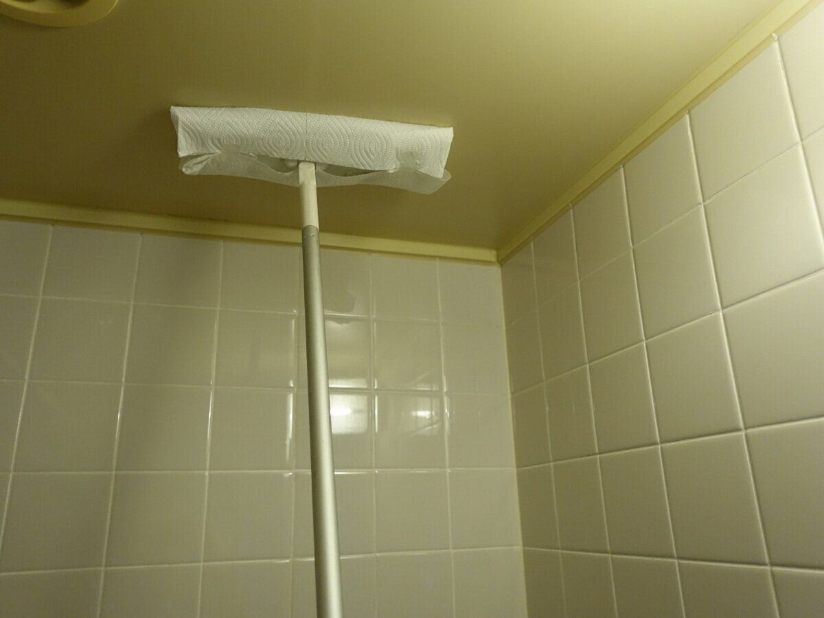 浴室などはカビ防止剤を塗っておきましょう。カビ防止剤の塗布は天井から行います。というのもカビの胞子は上から下に降りてくるからです。天井を掃除するにはフロアモップが便利。フロアモップにキッチンペーパーを取りつけて、そこへカビ防止剤を吹きつけて、天井を拭きましょう。掃除の際にはゴム手袋、マスク、ゴーグルをお忘れなく。