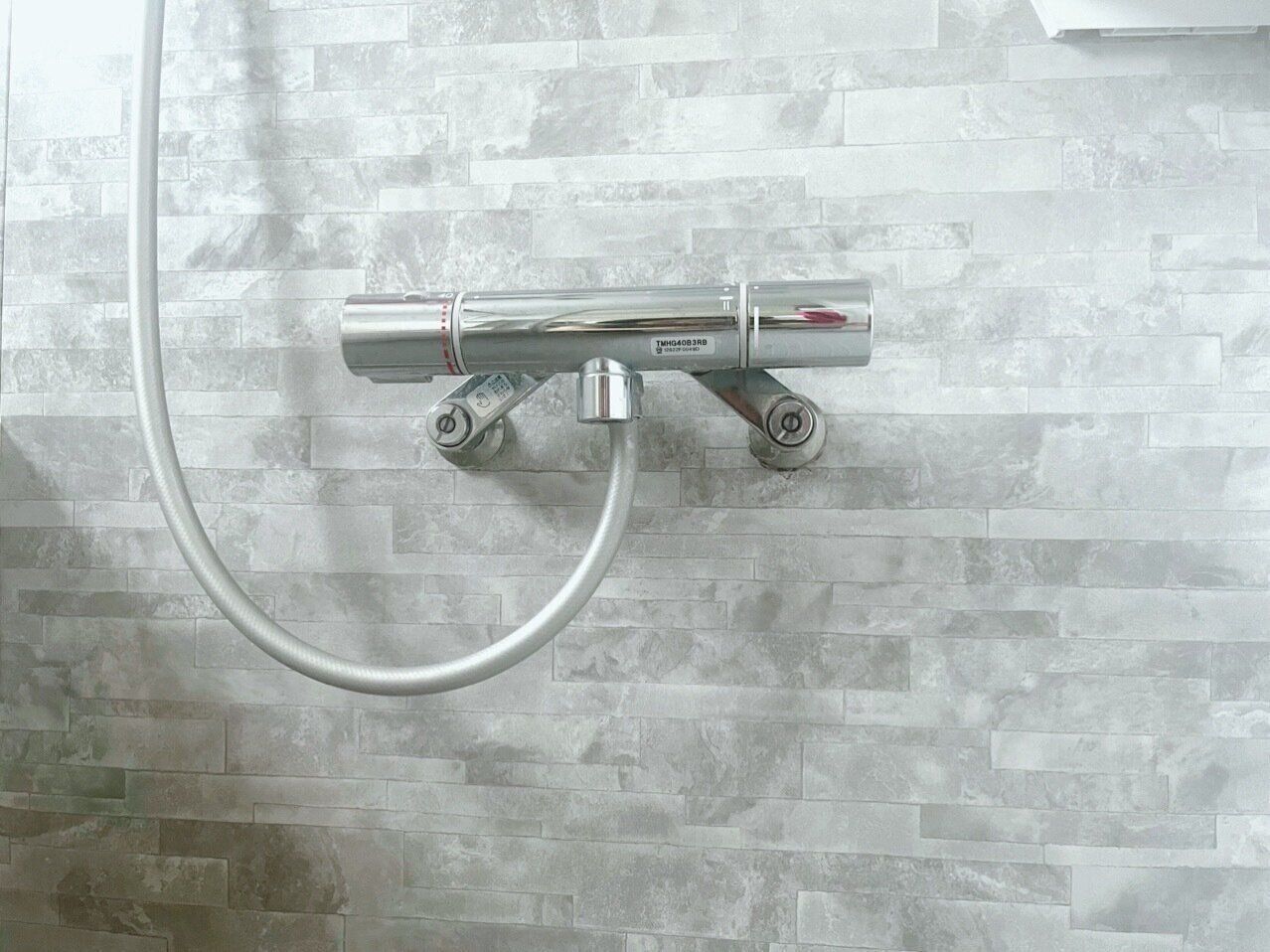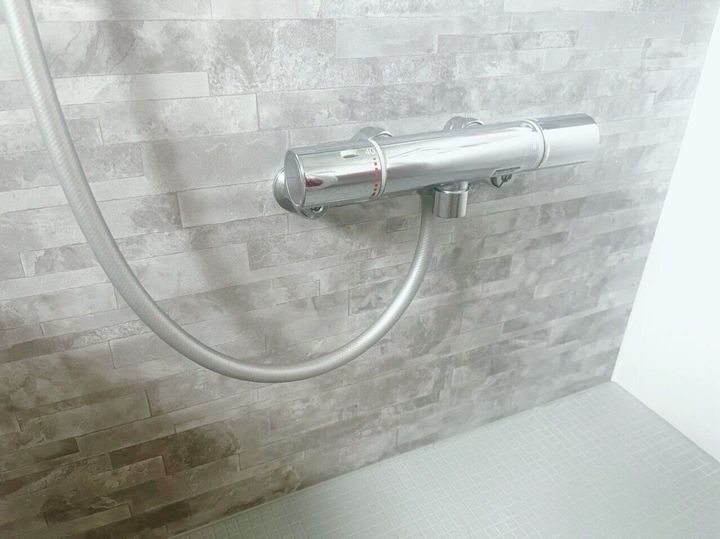 我が家の換気は、換気扇のみです。あらかじめ水切りワイパーを使用するため、夜に換気扇を回しておけば、朝には乾いています。写真のように、シャワーのホースも必ず浮かせ、ものとものが接している部分を極力無くします。