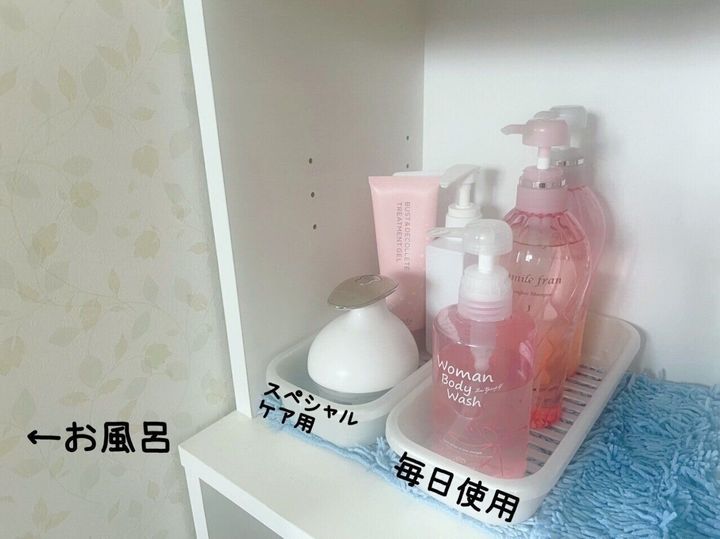 高温多湿を避けて保管できますし、家族がそれぞれ違うものを使用していて浴室にボトルが沢山ある方にはかなりオススメです。