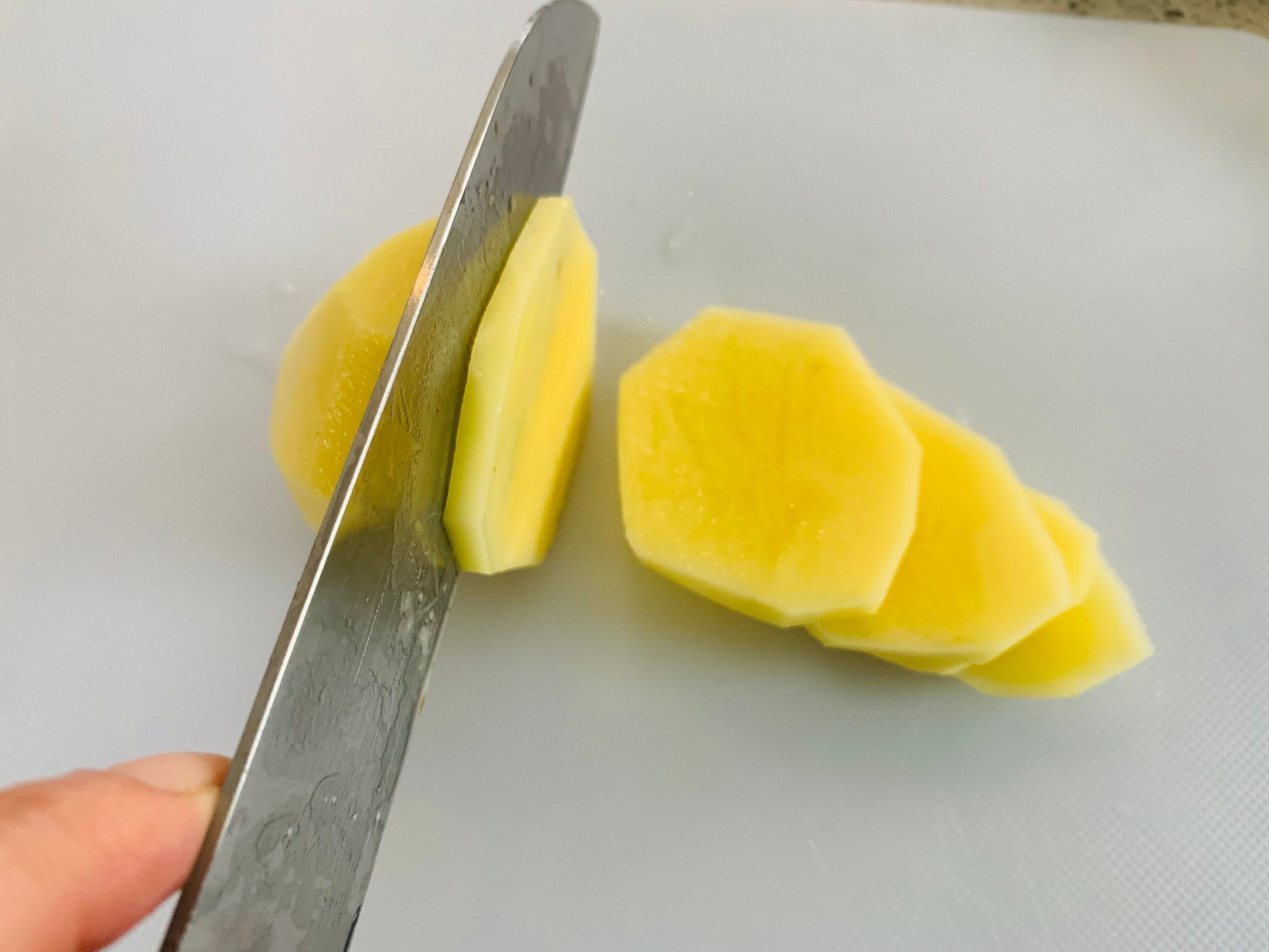 じゃがいもは皮をむいて、5mm幅くらいに切ります。