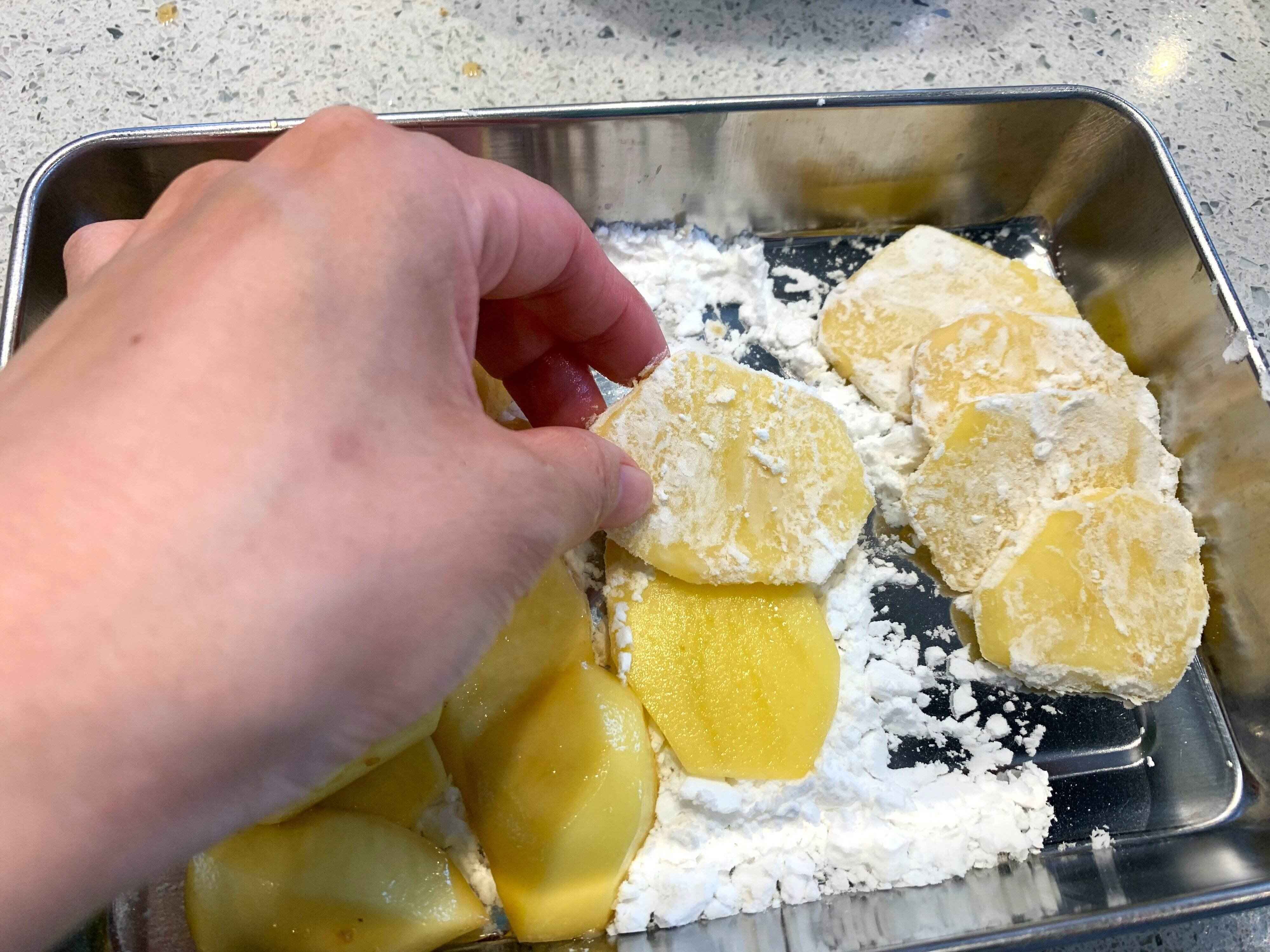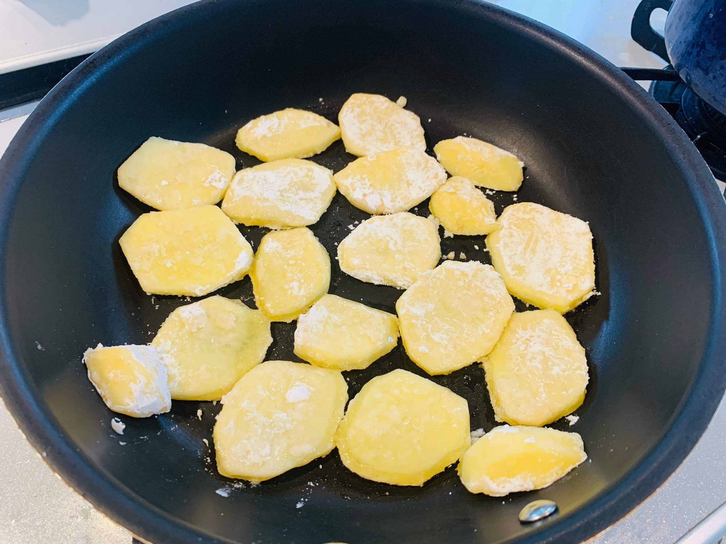 フライパンに油を熱し、じゃがいもを入れ、火が入るまで両面しっかり焼きます。片栗粉をつけることで、揚げなくても表面がカリッと仕上がります!