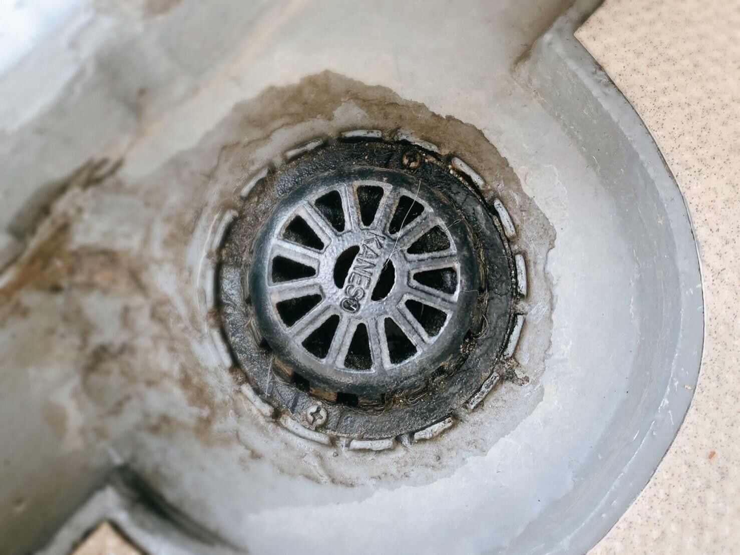 メラミンスポンジと流水で側溝掃除は完了です。しかし!忘れてはいけないのが排水口チェック。側溝の汚れが排水口に溜まっている可能性があります。そうなると排水口の流れが悪くなります。