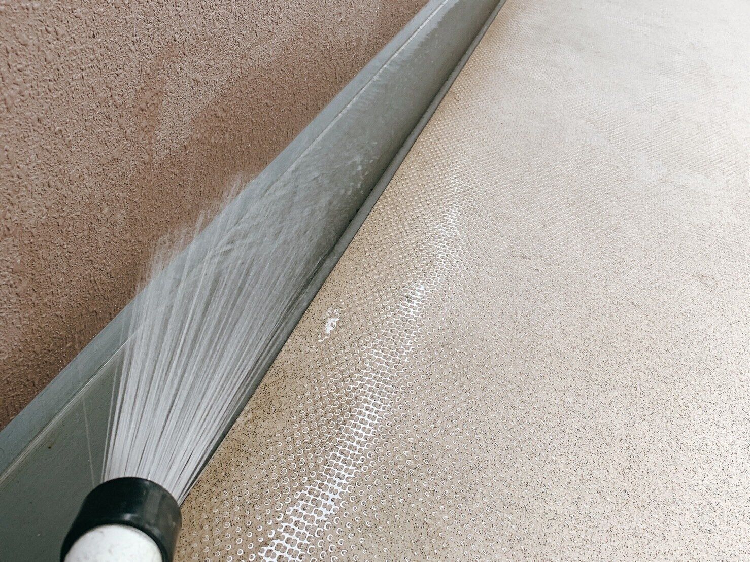側溝をメラミンスポンジでこすり終わった後は、排水口のある方向に向かって水で汚れを流していきます。バルコニーにホースがない場合は、バケツに水を入れて流してみてください。メラミンスポンジである程度の汚れは取れても、汚水が残っていますので、しっかりと洗い流しましょう。