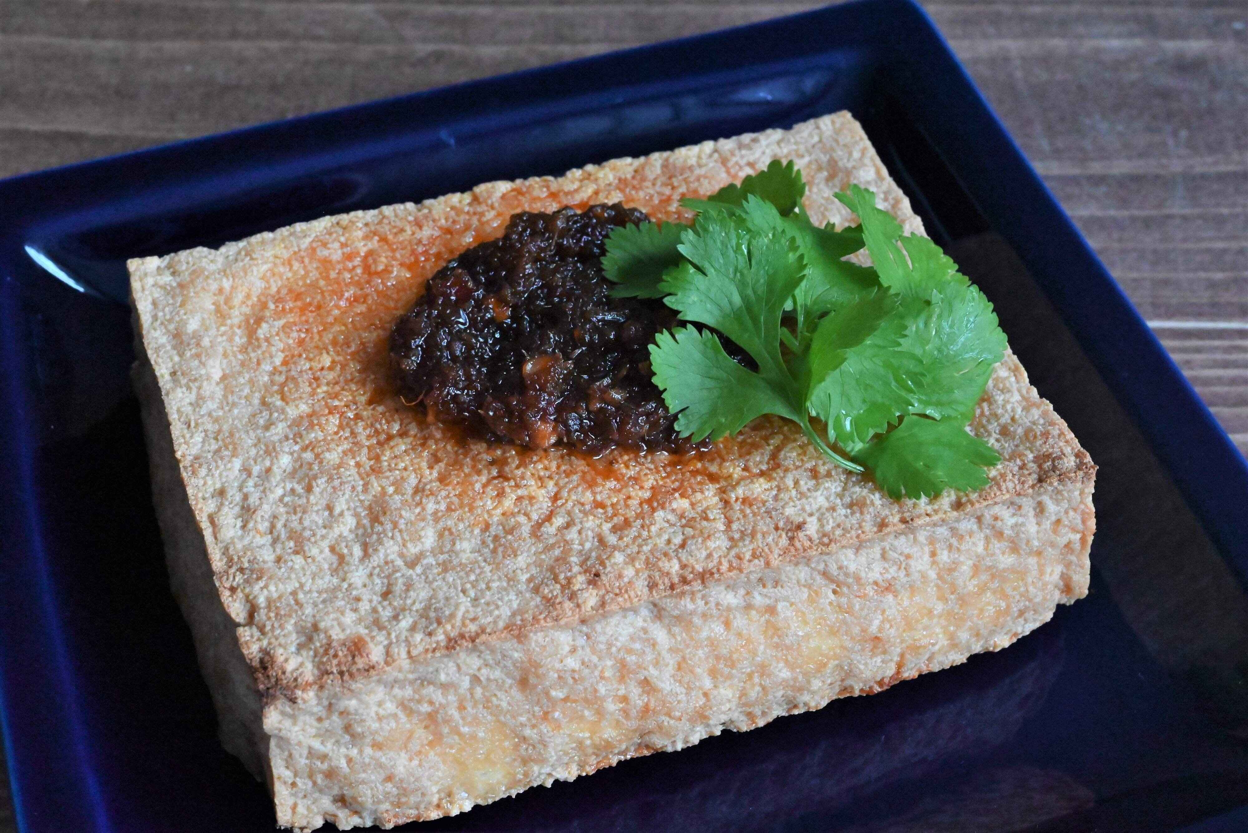 カリカリに焼いた厚揚げにパクチーとともにのせれば、ただの厚揚げが一気にベトナム料理に大変身!