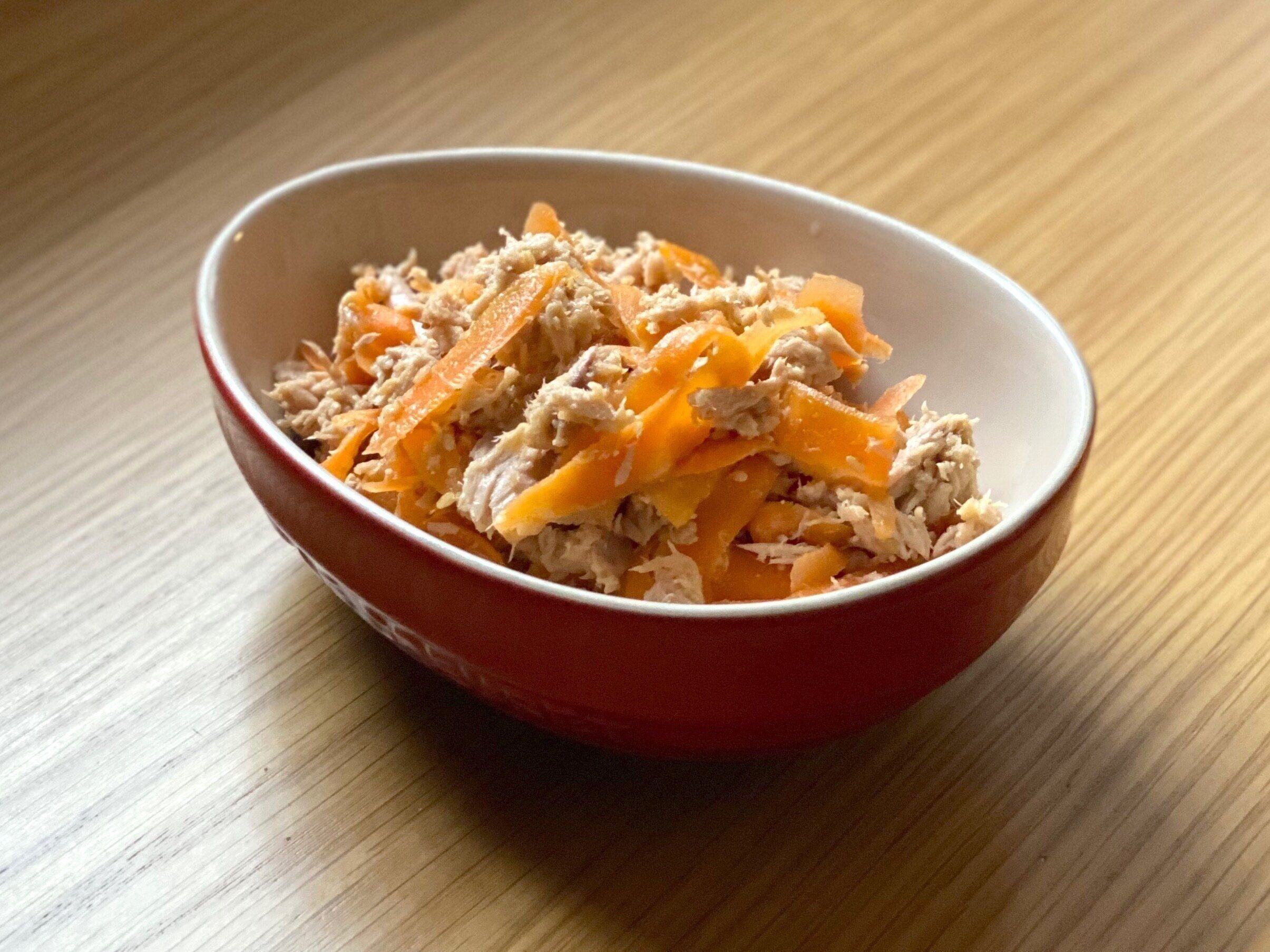 ツナの旨味とにんじんの甘味が白米によく合う一品。にんじんはピーラーでカットすることで味がよくなじみ、ツナとの絡みもよくなります。子ども達が好きだった「給食のツナふりかけ」からヒントをもらいましたよ。