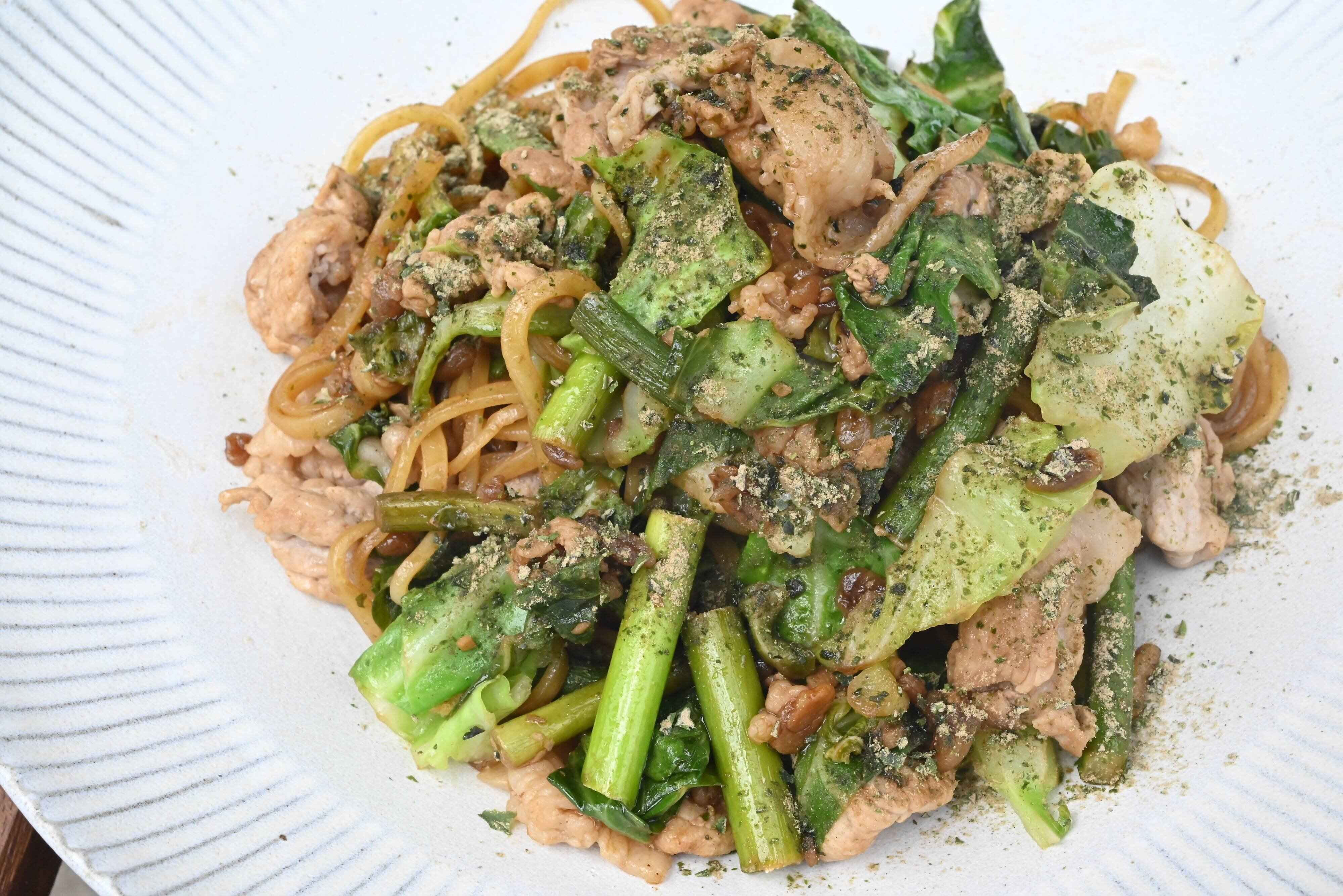 後からかけるだし粉のおかげで風味豊か!太めの麺に濃厚ソースが絡み、ガッツリ食べたい時にピッタリです。