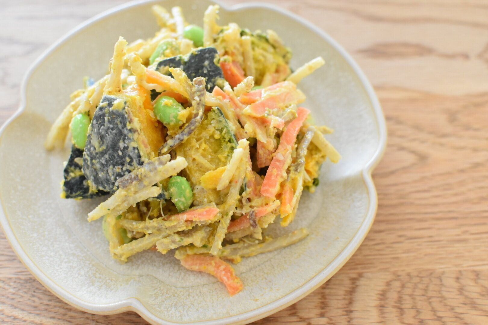 作り方はブロッコリーのサラダとほぼ同様ですが、加える野菜がかぼちゃに変わるだけで違った印象に。彩りと食感のために枝豆もプラスすれば、デリ風のサラダのような仕上がりに。