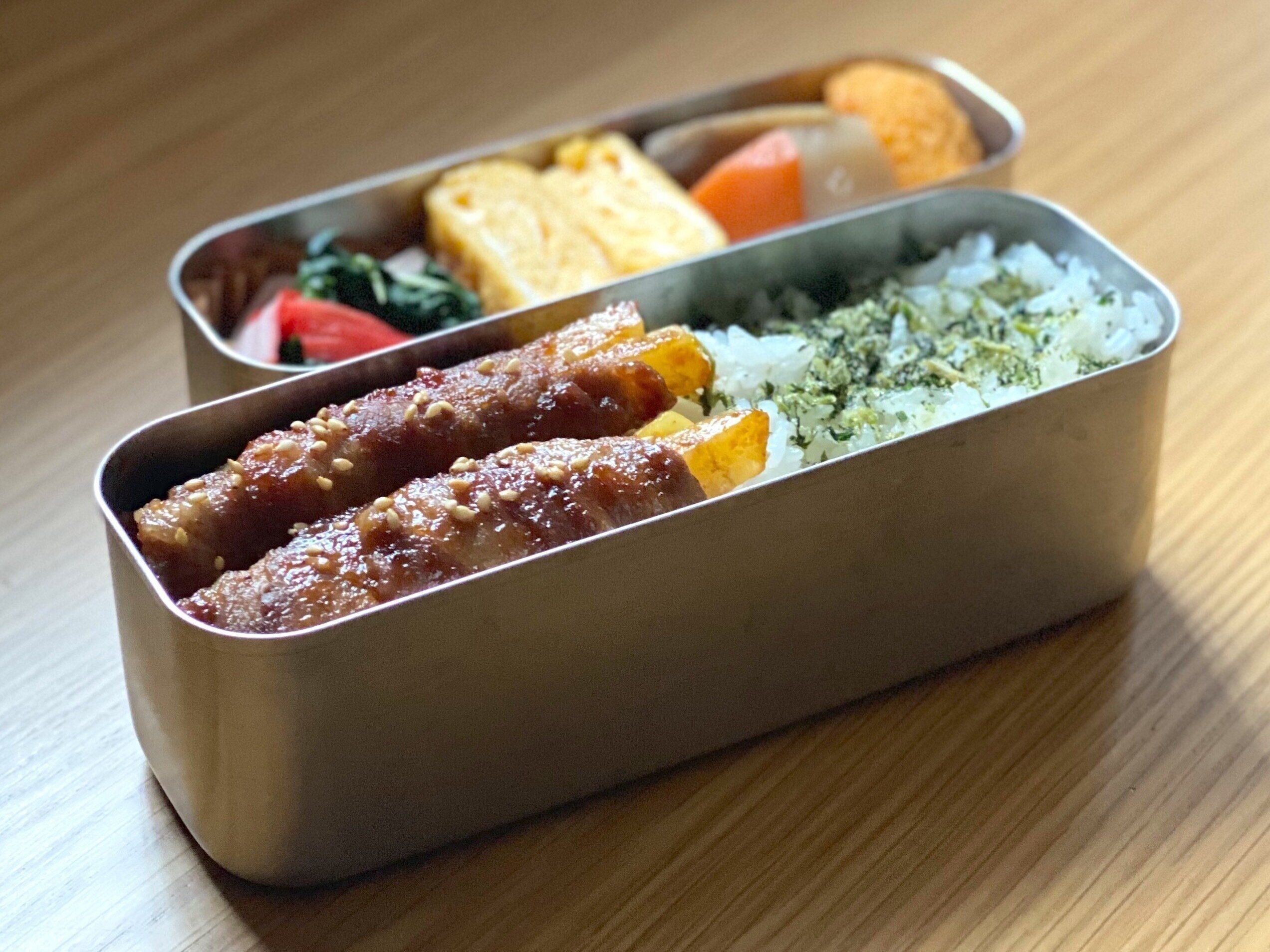水曜日はじゃがいもの肉巻き弁当です。100均の電子レンジ蒸し器でじゃがいもを蒸し、豚肉でクルクルと巻くだけ。甘辛い味つけに仕上げているのでご飯が進みます。