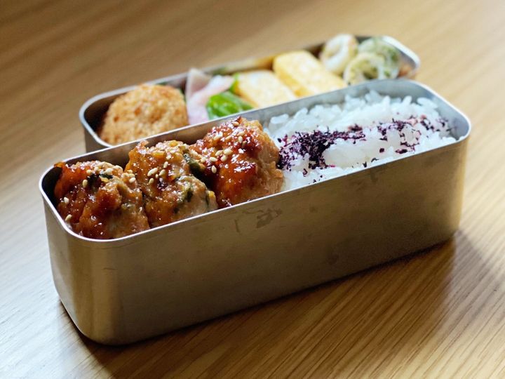木曜日は、大葉入りつくねがメーンのお弁当。つくねをつくっている間に、副菜のちくわのマヨ海苔焼きとベーコンとピーマンの炒め物をトースター調理。同時進行で3品つくって調理時間を短縮しています。豆腐を入れたつくねは柔らかく冷めてもおいしく食べられますよ。
