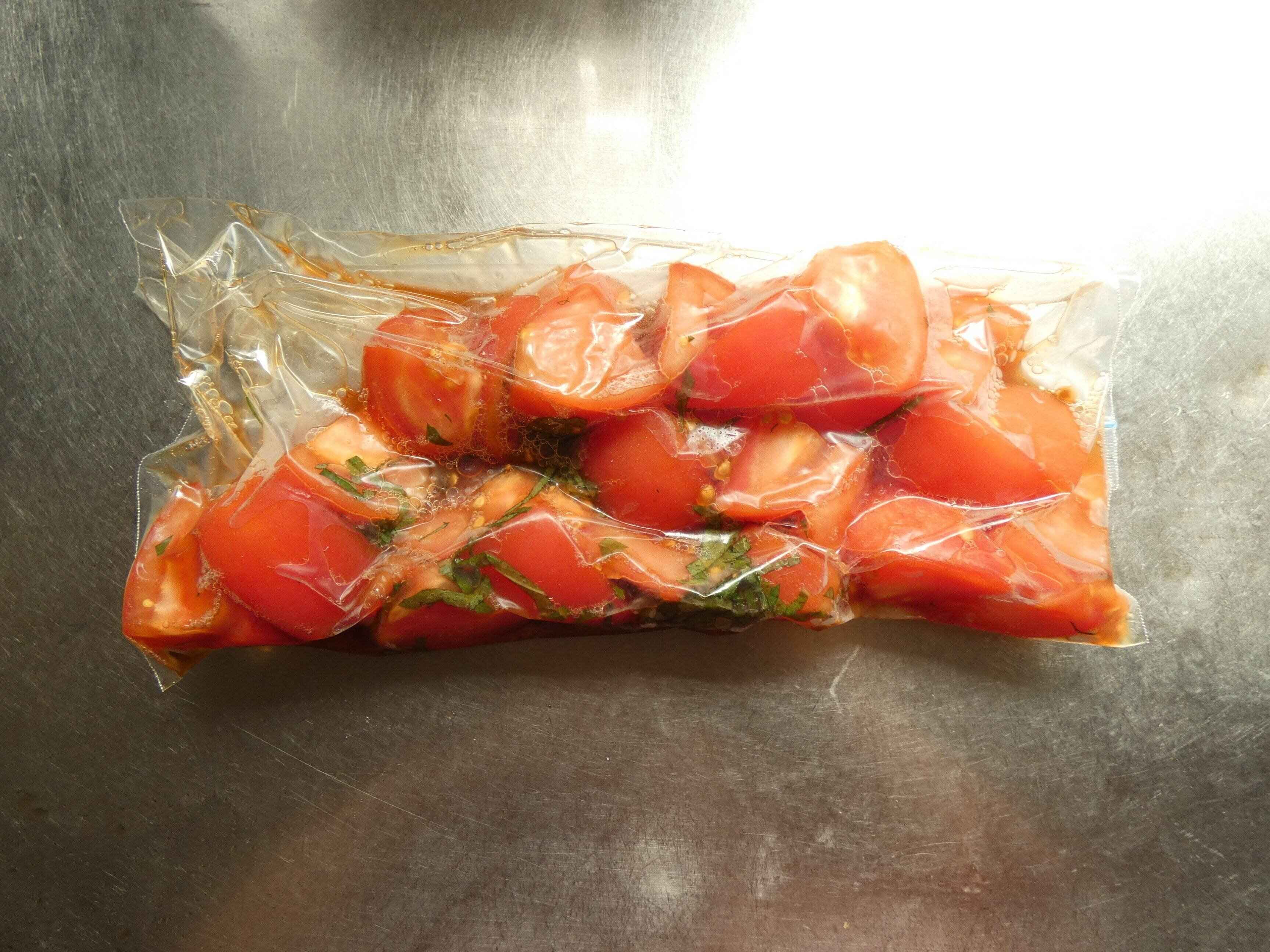 2.ジッパーつきの袋にトマトとシソ、めんつゆを入れて軽く混ぜ合わせます。冷蔵庫で1時間くらいつけてしっかり冷やしたら完成。