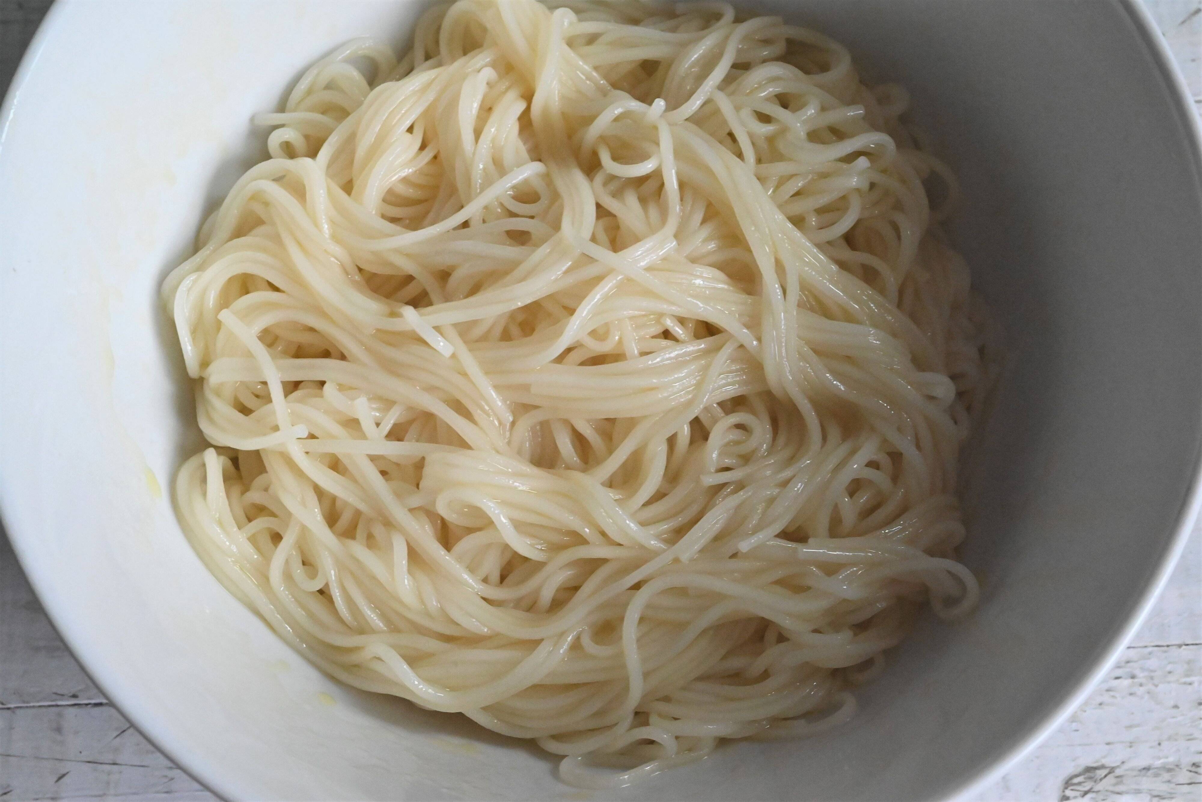 (2)そうめんを表示時間どおりに茹でて冷水で締め、オリーブオイルを和える。
