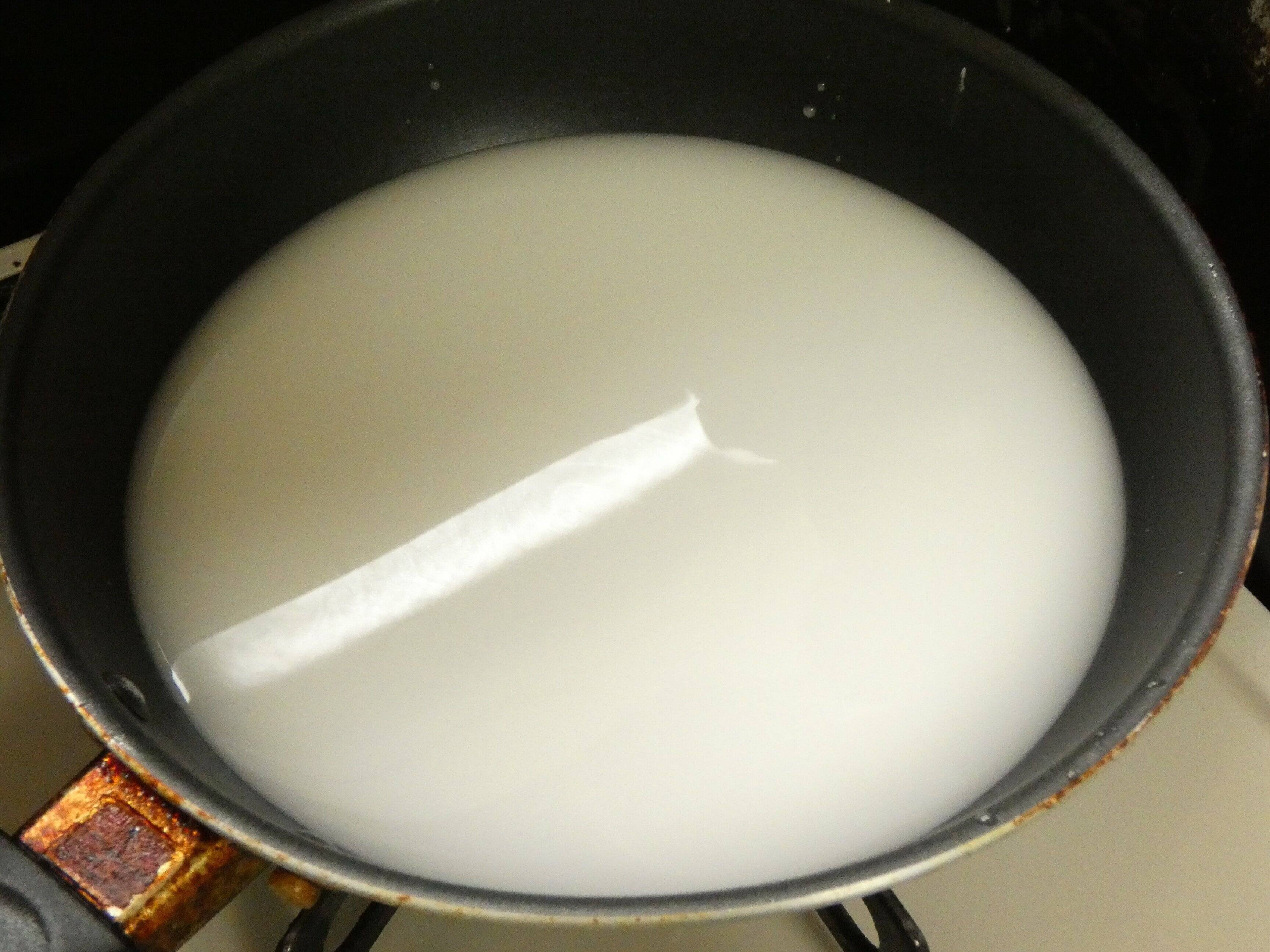 初めはサラサラの液体ですが、固まり始めると一気に全体が固まりずっしり重くなります。火にかけながらしっかり混ぜ続けると、ダマになりにくいです。