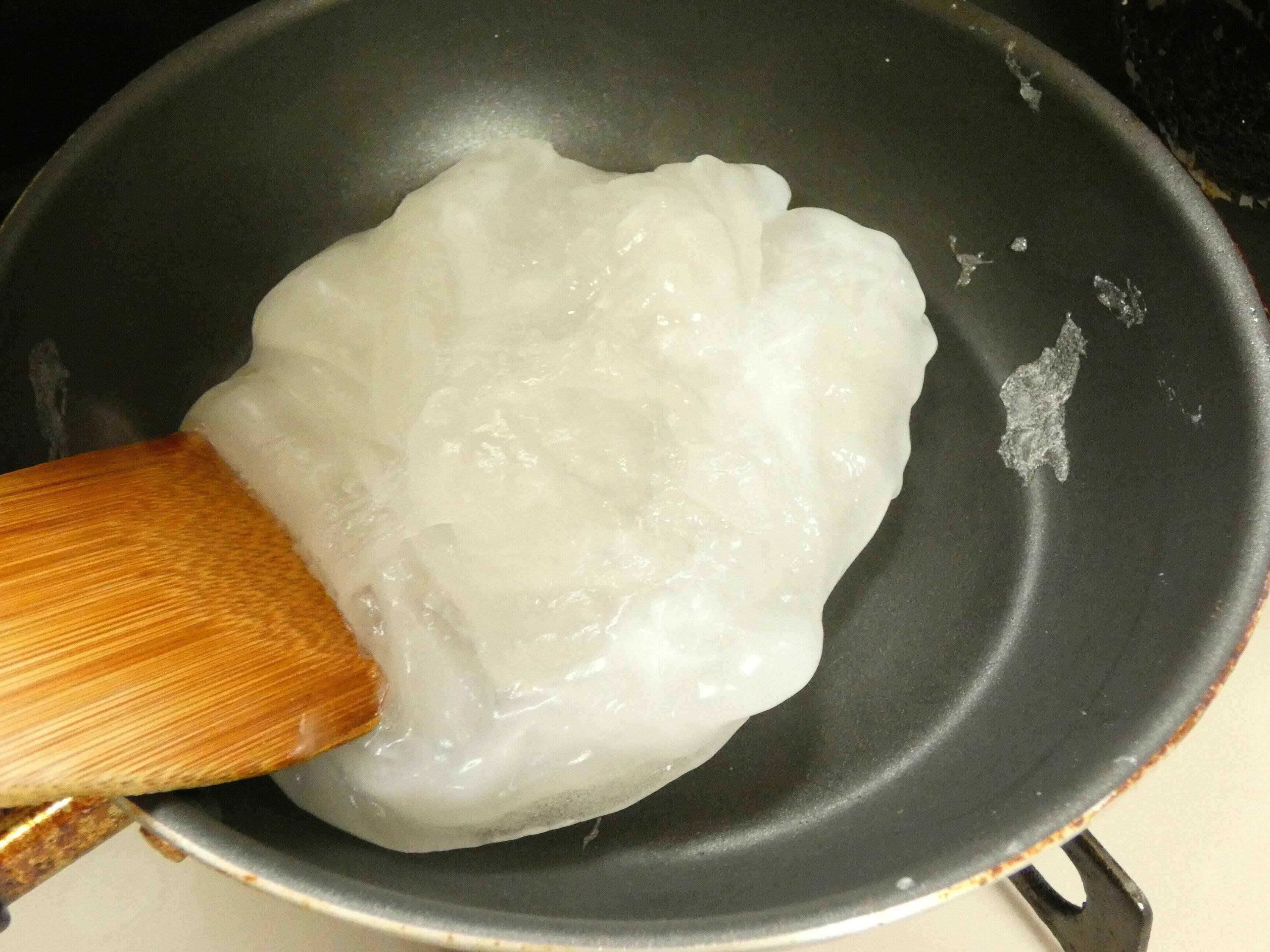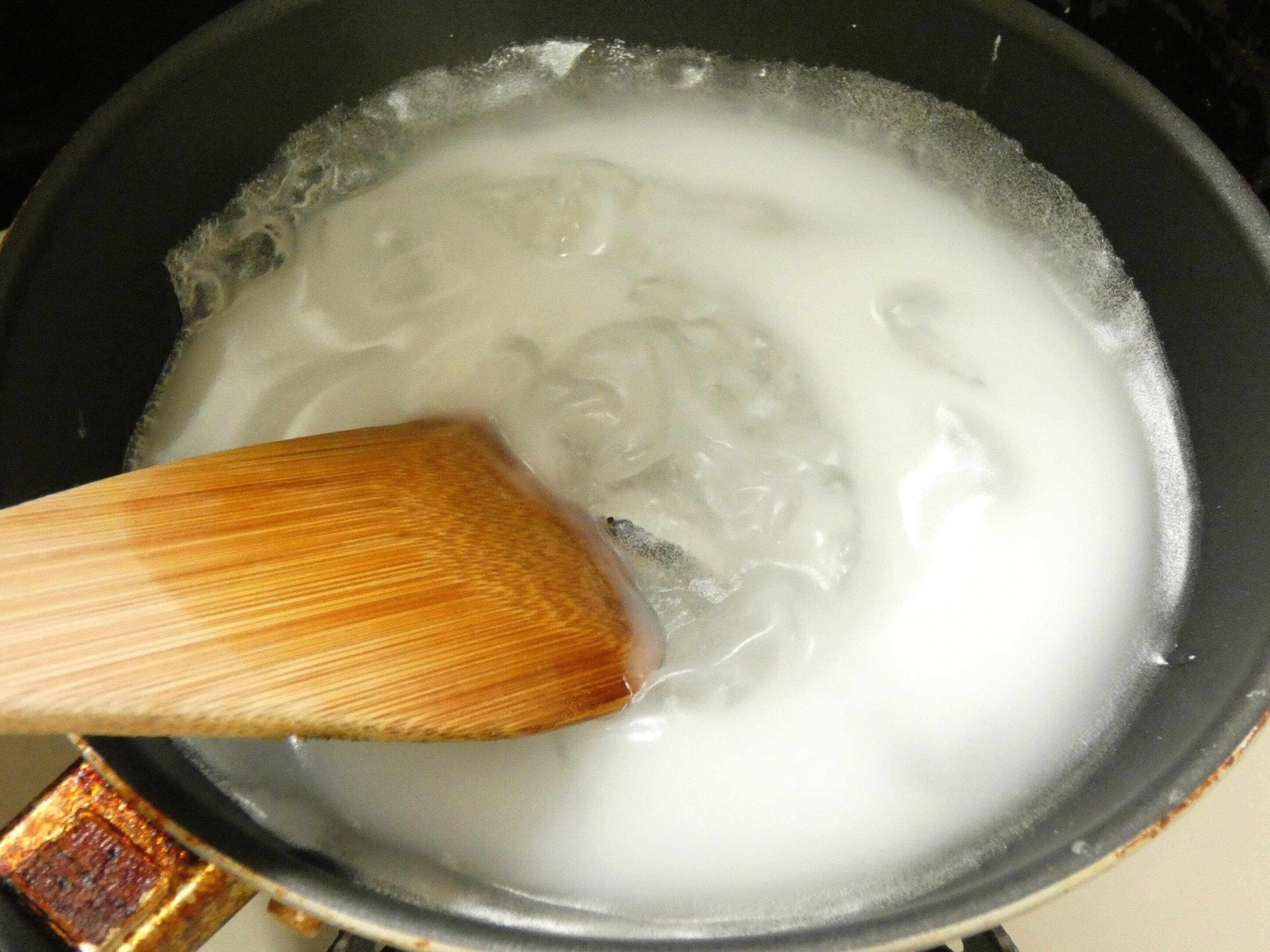 2.木べらなどで混ぜながら火にかけると、サラサラだった液体が透明になってきます。