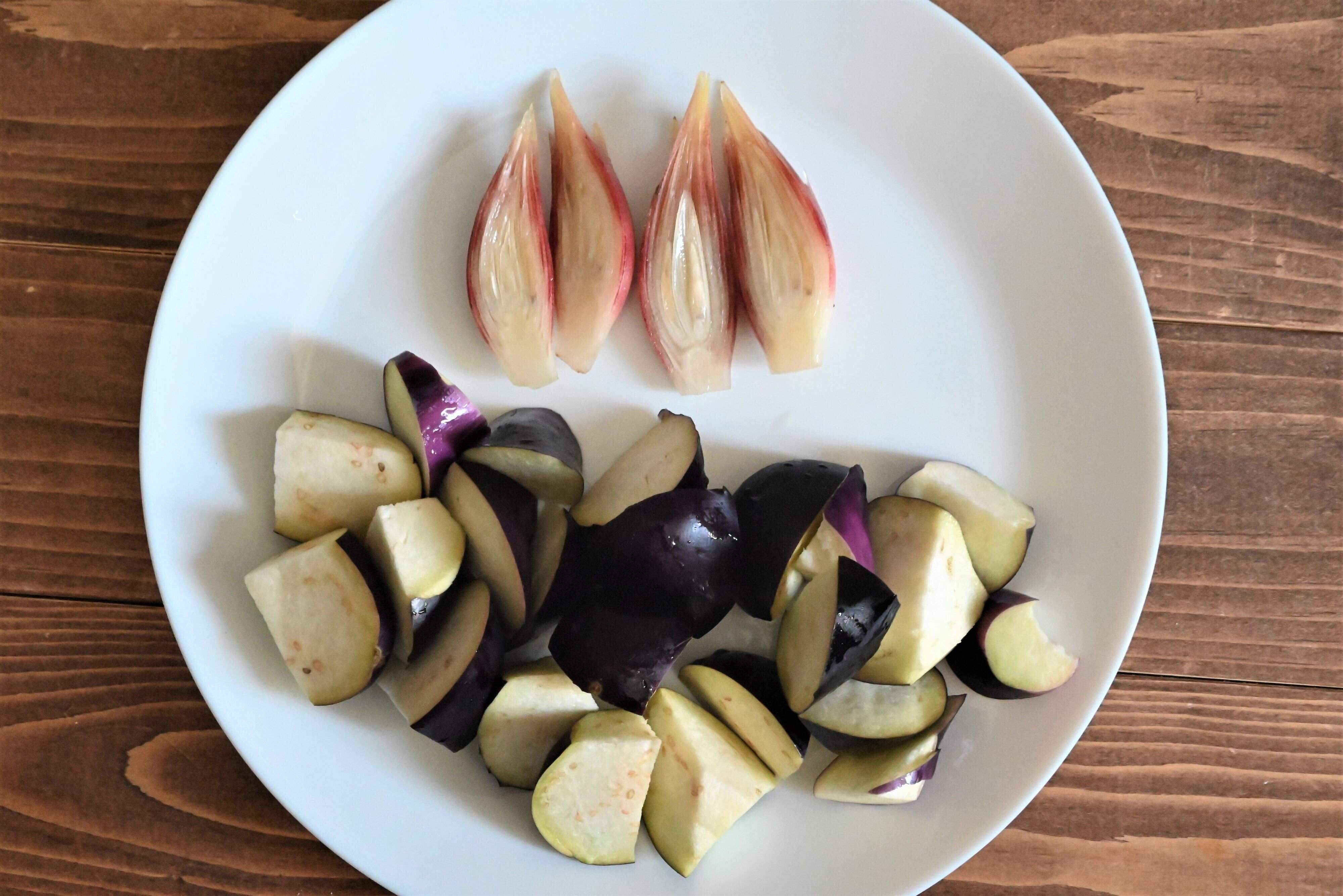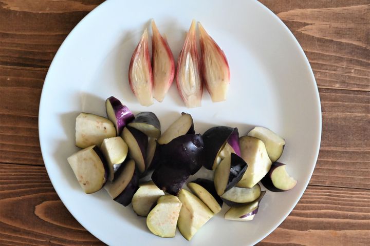 (1)なすは乱切り、みょうがは2等分にする。