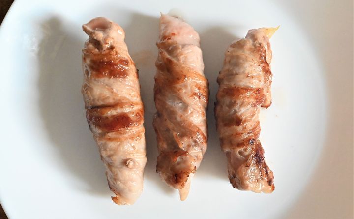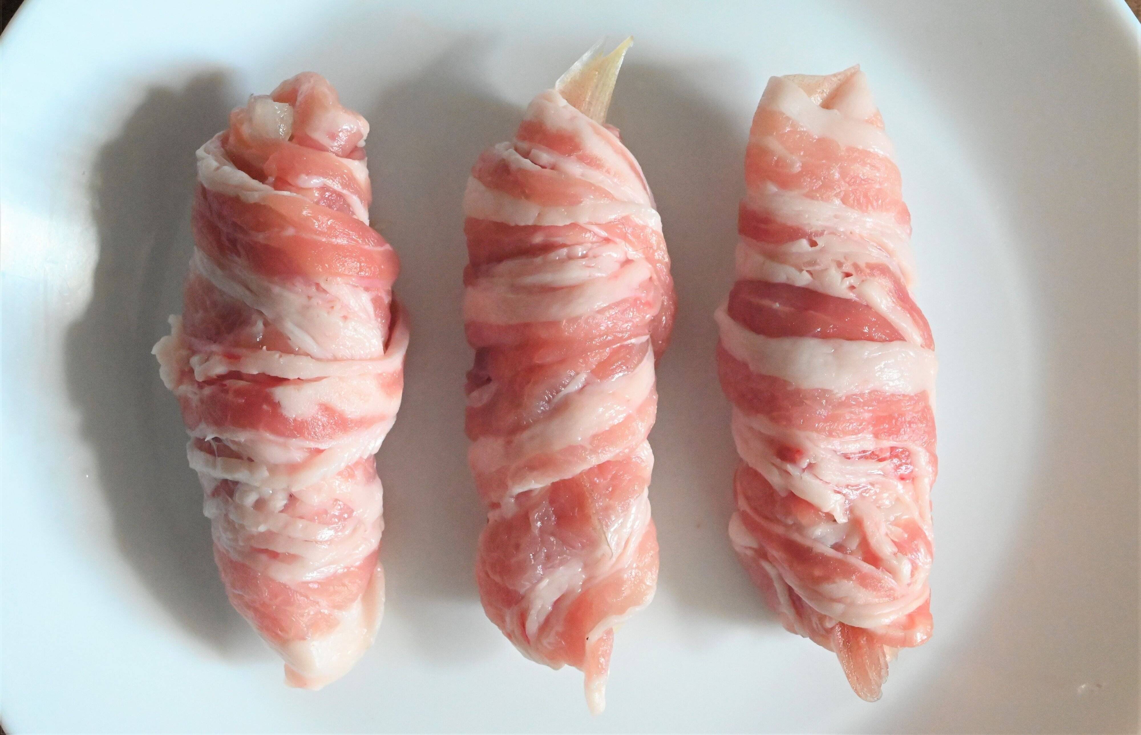 みょうがを3等分に分け、豚バラ肉をきつく巻き付ける。