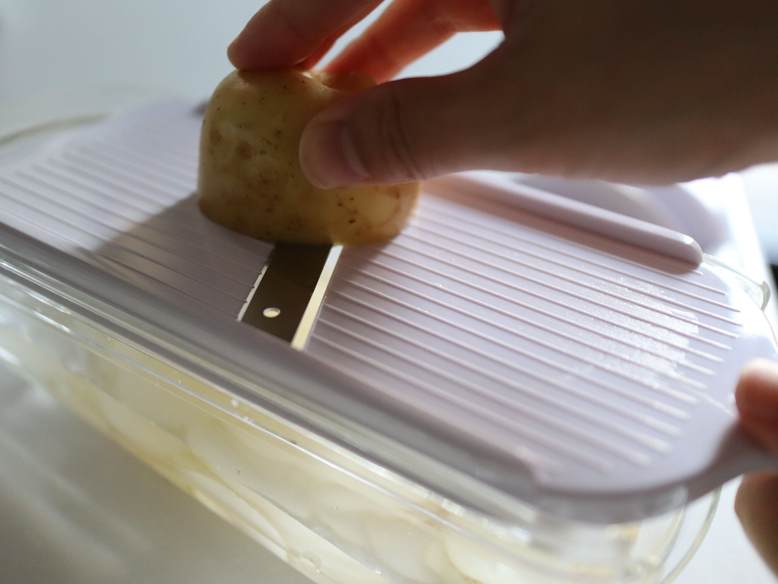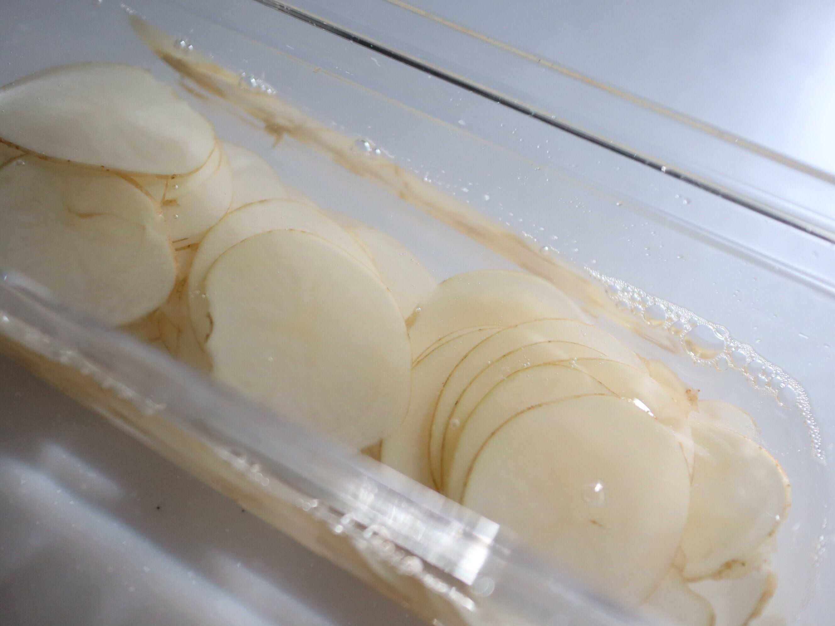 (1) じゃがいもはよく洗って芽を取り、皮つきのままうすくスライスする。(スライサーを使うと便利。)