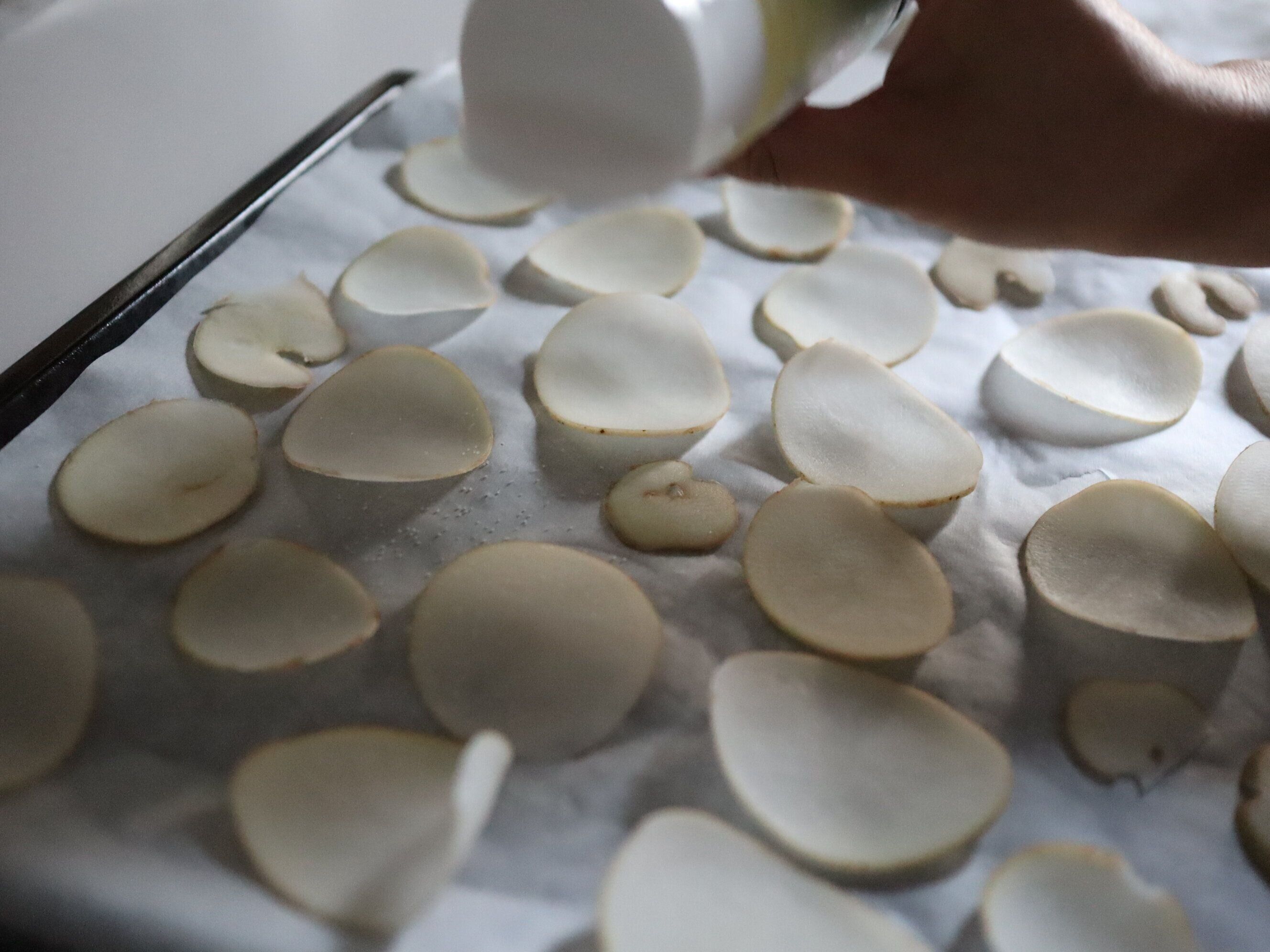 (4) クッキングシートの上に重ならないように並べ、塩をふりかける。