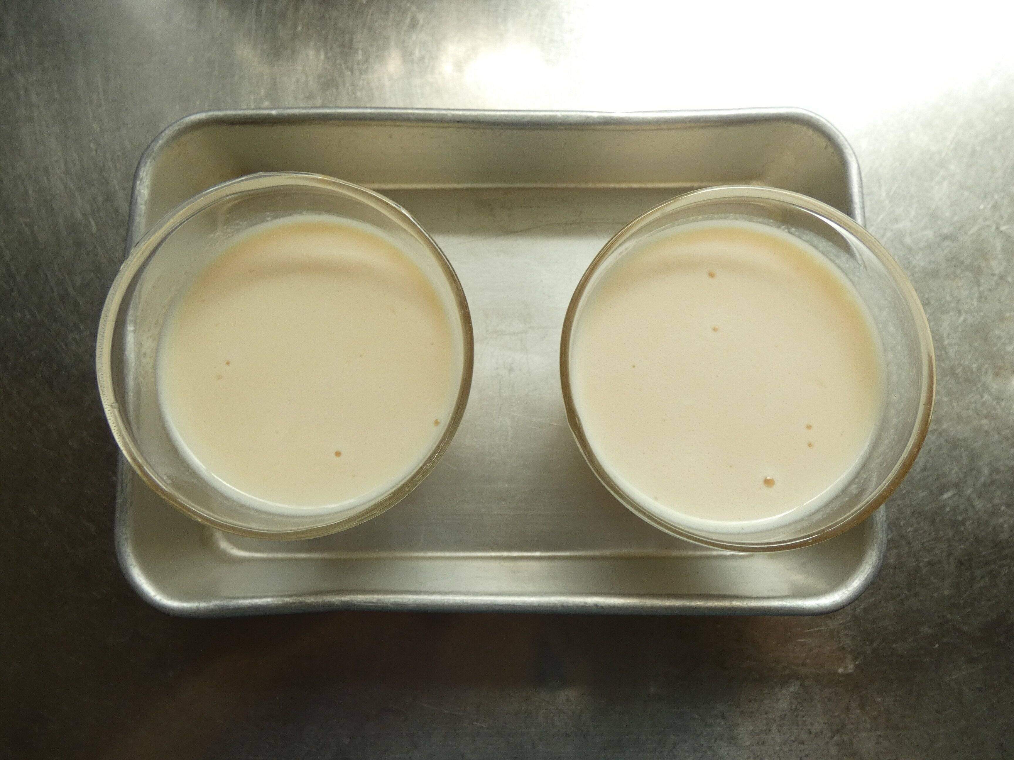 2.牛乳を電子レンジ600Wで2分加熱し、砂糖を混ぜ合わせて溶かします。